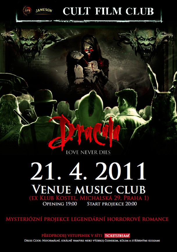 Kultovní snímek Dracula: Love never dies vám bude představen v originálním znění s tituky a ve skvělé kvalitě z BLU-RAY disku. Po projekci následuje vampírská zábava, která může za přítomnosti krvelačného knížete nabýt tisíce podob a neočekávaných rozměrů. Zaručit můžeme jen to, že namísto (či kromě) krve naplní poháry irská whiskey Jameson. Vydejte se vstříc kontrovernímu hrdinovi, jenž se pro nenaplněnou avšak nehynoucí lásku postavil na stranu Zla. Na jakou stranu se postavíte vy, zůstává jen na vaší volbě. Dorazit můžete vyzbrojeni česnekem, dřevnými kůly či stříbrnými kulkami. Vítáni ale budete i jako stoupenci krutého, leč charismatického ďábelského aristokrata ve vampírské róbě.