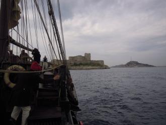 Návrat do Itálie se odehrává na podobné trase. V úterý jsme ráno kotvili v laguně v ústí Rhóny, odpoledne v Marseille poblíž pevnosti Saint Jean (kde kdysi sídlila Cizinecká legie, zapsala se do našich vojenských dějin a prošla i Velinského antarktickým cyklem) a večer jsme na chvíli zastavili před Dumasem proslavenou pevností If. V noci jsme se na motor přesunuli k Toulonu, kde jsme u pláže strávili středeční dopoledne. Došlo na koupání, pár lidí se vydalo na rychlý výlet do města a zbytek se na palubě pokoušel zcivilizovat za úvah, jestli by se Francouzi po první ráně z děla tradičně vzdali, nebo neméně tradičně potopili. Fregata zakotvená u mola na druhém konci zátoky byla zjevně ve stavu, že by ji poslalo ke dnu bouchnutí pytlíku od svačiny.