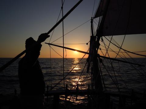 V pozdním odpoledni jsme chytili příhodný vítr a napínáme plachty. Čeká nás noční plavba na Korsiku do Port Macinaggio a moje první noční služba u kormidla. Při svitu Měsíce míjíme pravobokem Capraiu a potvrzuje se zkušenost Wilfa Brima (cyklus „Navigátor“), že je třeba sledovat okolní prostor na vlastní oči a nepřesouvat se jen podle přístrojů. Nevyladěný mapový plotr silně oslňuje a okolo je občas dost živý provoz, kterému je třeba se vyhnout. Jízda čistě podle přístrojů mi zoufale nejde. Od kormidla na staré plachetnici navíc není skoro vidět dopředu – v ose lodi jsou stěžně, většina lanoví, část plachet a občas i posádka – proto musí s kormidelníkem spolupracovat několik mužů na hlídce. Ta je rozmístěna po palubě a nikoliv v koši – výhled ze stěžňových košů ve většině sektorů fakticky znemožňují napnuté plachty a stoprocentní výhled je jen z hlavního brámového ráhna, což je relativně tenká kulatina někde 25 – 30 m nad hladinou, na které se bez patřičného cvičení nedá strávit mnoho času.