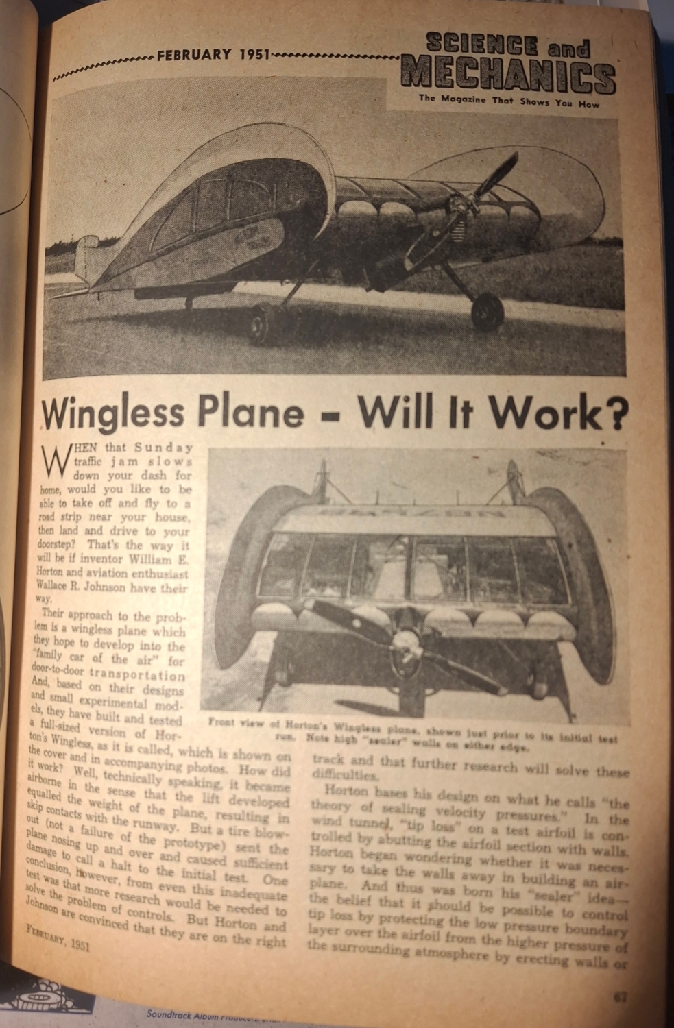 To „něco“ se jmenuje Horton Wingless Plane a posunuje už tak ztřeštěný nápad Horton Wingless V-16 do úplně jiné dimenze. Do jeho těla totiž zabuduje kabinu pro pasažéry a udělá z něj létající auto. Horton Wingless V-16 sám o sobě sice fungoval, ale měl dva motory a stabilizační křidélka. Jeho trup tvořil spíš talíř než kapku a boční plochy opět stabilizovaly let. Byla to prostě Multipla mezi letadly – hnusná, ale funkční.