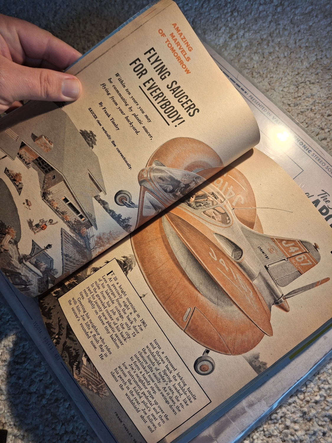 Takový byl nadpis článku Franka Tinsleyho z roku 1955. Článek začíná tvrzením, že už za pět let bude možné koupit si vlastní létající talíř. Malý osobní stroj, který bude „parkovat na dvorku a odstartuje z příjezdové cesty“.
