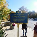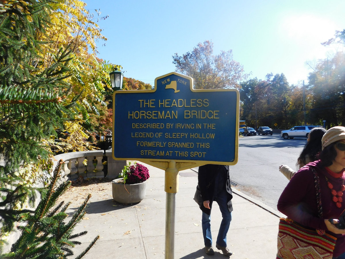 Během druhého Halloweenu jsme měli nutkání navštívit některé typicky halloweenské turistické místo. Nejdřív byl v hledáčku Salem v Massachusetts, ale nakonec zvítězila Sleepy Hollow ve státě New York. Sleepy Hollow je zajímavé hlavně tím, že se tam odehrává legenda o bezhlavém jezdci, kterou většina z nás zná z filmu s Johnny Deppem. Legendu o bezhlavém jezdci proslavil Washington Irving. Tenhle příběh je v Ospalé díře všude kolem vás. Město má dokonce kostel postavený na Irvingovu počest a spoustu cedulí, které vám připomenou, že právě tady ožívá příběh učitele Ichaboda Cranea (v případě filmu policisty) a tajemného jezdce bez hlavy. A nesmíme zapomenout i na cedule směřující na zdejší velice starý hřbitov, které upozorňují, že právě mezi jeho náhrobky se bezhlavý jezdec projížděl. Cedule u vstupu na hřbitov zní: „Headless horseman tethers his horse nightly among graves in this churchyard, according to the legend of Sleepy Hollow.“ Když jsme zaparkovali v jedné z postranních ulic a procházeli městečkem směrem k hřbitovu, výzdoba vás opravdu nenechá na pochybách, kde se nacházíte. Stojí tu trvalá socha bezhlavého jezdce a během prohlídky jsme narazili na další. Součást halloweenských dekorací nebo třeba nafukovací u stánku se suvenýry. Sleepy Hollow si legendu hýčká jako rodinné stříbro a nenechá vás na pochybách o americké podnikavosti. Nejen že je víkend před Halloweenem hřbitov plný turistů korzujících mezi hroby a čtoucích náhrobky, nejen že se zde koná průvod, na který jsme dorazili, ale hlavně – to město se dříve nejmenovalo Sleepy Hollow. Původně se jmenovalo North Tarrytown, bylo oficiálně založeno v roce 1874, ale už v roce 1672 tu bylo první osídlení lidmi z Holandska.