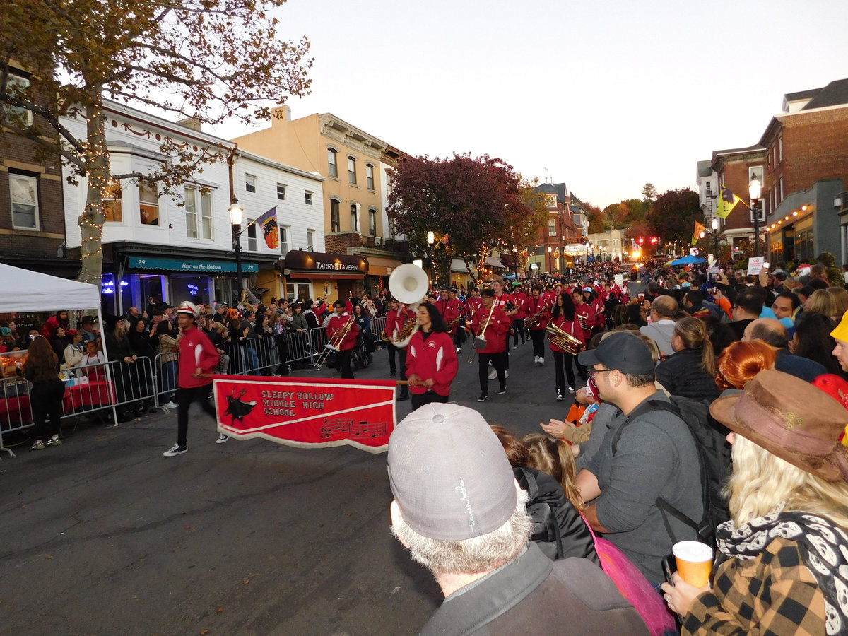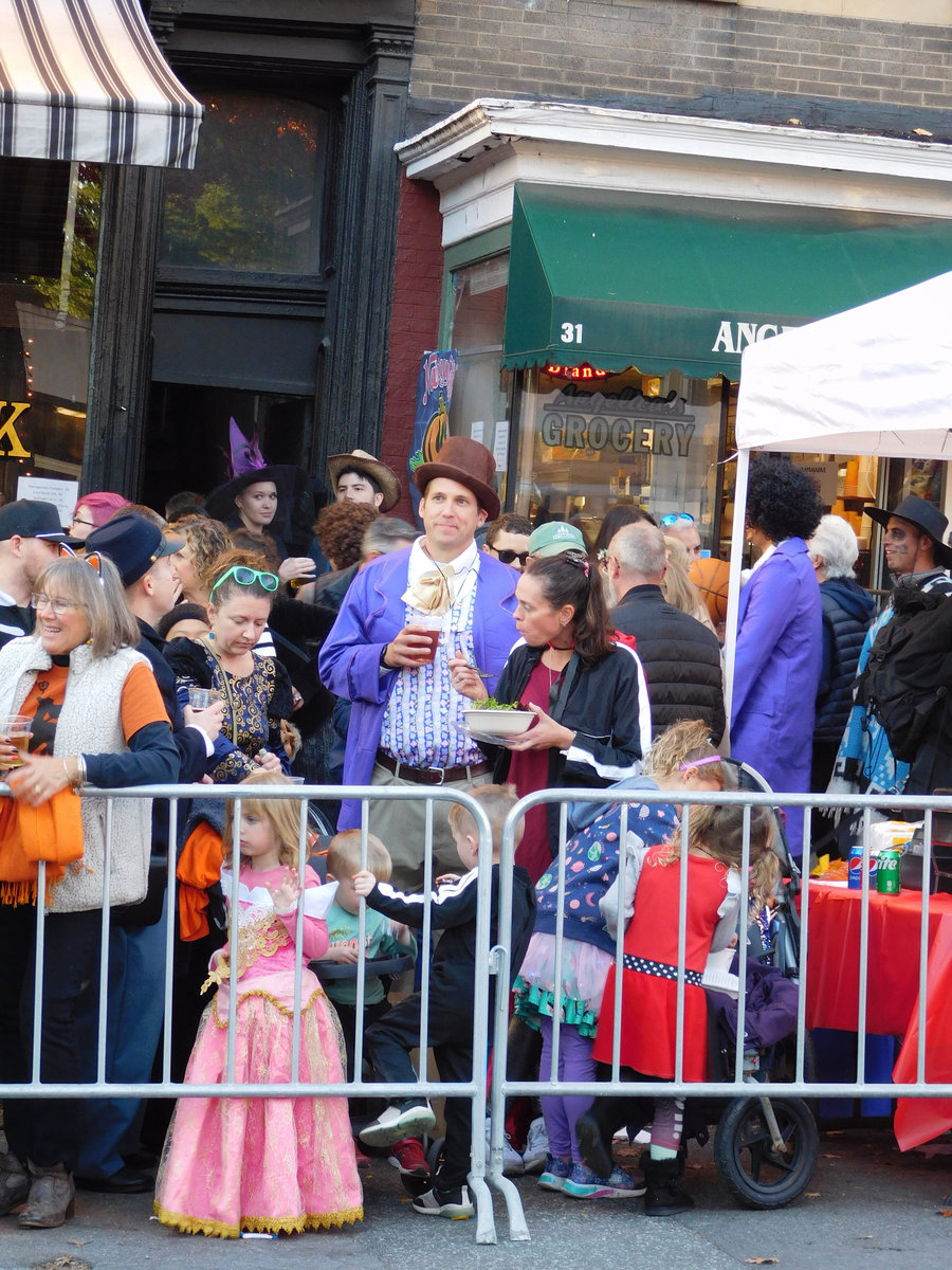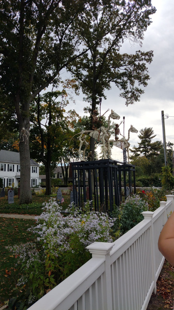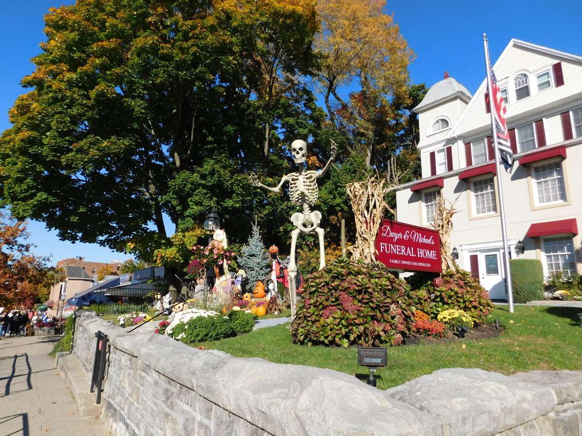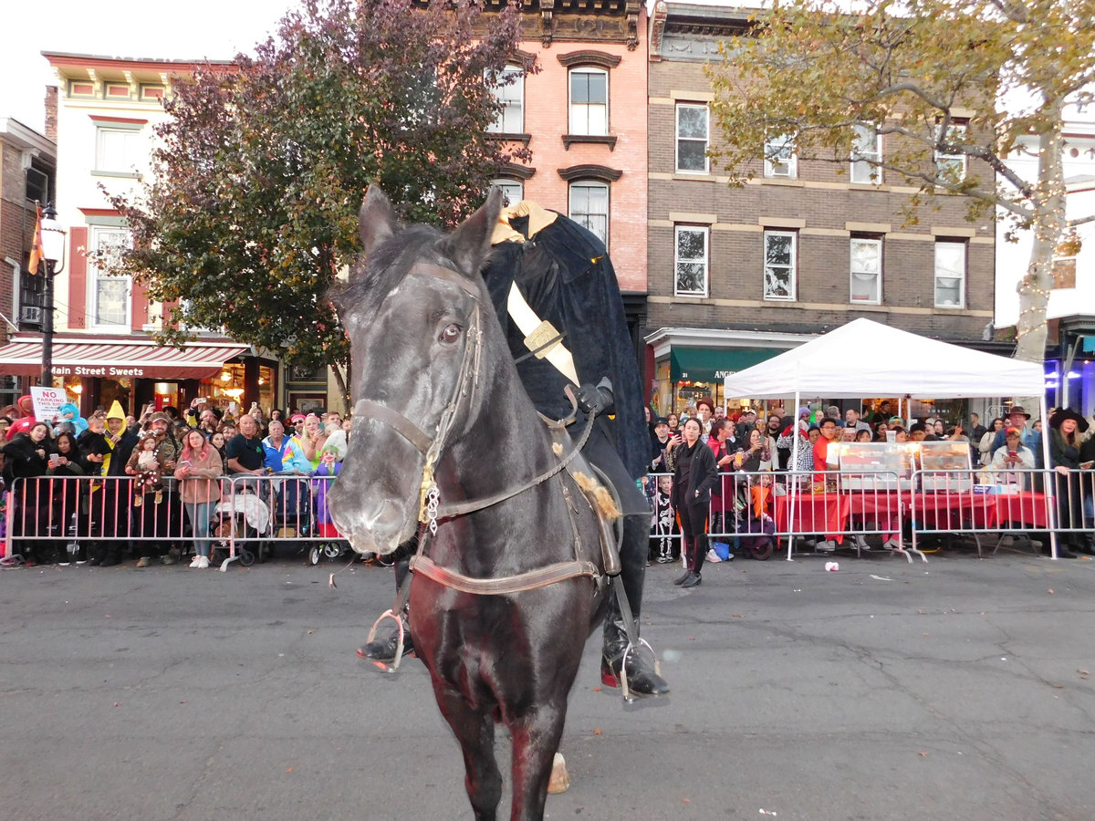 Když jsme opustili hřbitov ve Sleepy Hollow, kde se má podle legendy noc co noc prohánět bezhlavý jezdec mezi náhrobky, pokračovali jsme pak dolů do města. To už se pomalu začínalo chystat na nadcházející večerní průvod a s každou minutou přibývalo lidí v kostýmech. Najednou jste na každém kroku potkávali postavy z Marvelu, lidi převlečené za postavy z mexického Día de los Muertos, různé strašáky, duchy a sem tam i někoho, kdo vypadal, že utekl z gotického salónu nebo ze staré pohádky. Celé město bylo vyzdobené. Městské hodiny měly na sobě dýňového strašáka, některé domy i podniky nesly pavučiny, lebky a dýně snad všude. Před místním pohřebním ústavem Dwyer & Michael’s Funeral Home byl dokonce obří, asi třímetrový kostlivec a kolem něj hromada plastových náhrobků a dýní. A mezi nimi samozřejmě bezhlavý jezdec. Lidi se bavili, posedávali v kavárnách a pekárnách, kde se prodávaly halloweenské sladkosti, sušenky a lízátka ve tvaru lebek a dýní. Pomalu se stmívalo, hudba se rozléhala ulicemi a davy se začaly shromažďovat podél trasy průvodu. Jakmile se setmělo, průvod vyrazil. Fotky z něj mám bohužel jen z levného mobilu, takže nejsou kdovíjaké, ale pokusím se vybrat ty nejpoužitelnější. Atmosféra ale byla nezaměnitelná.