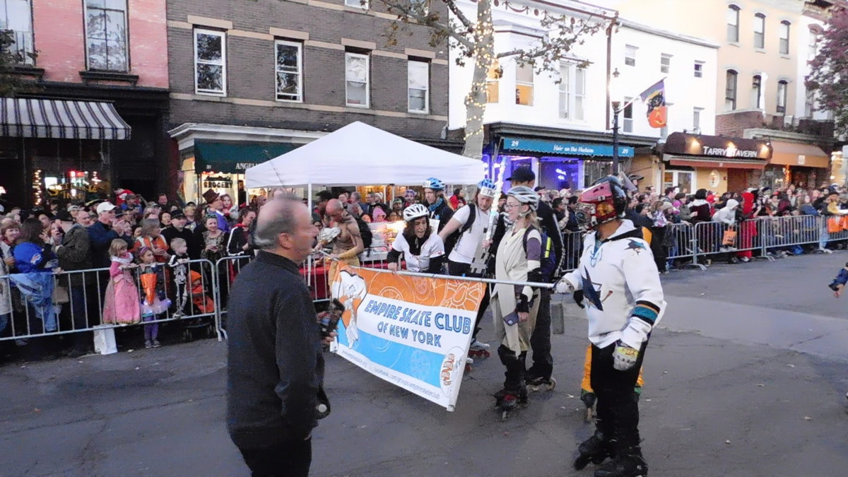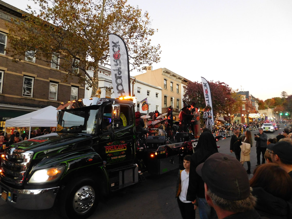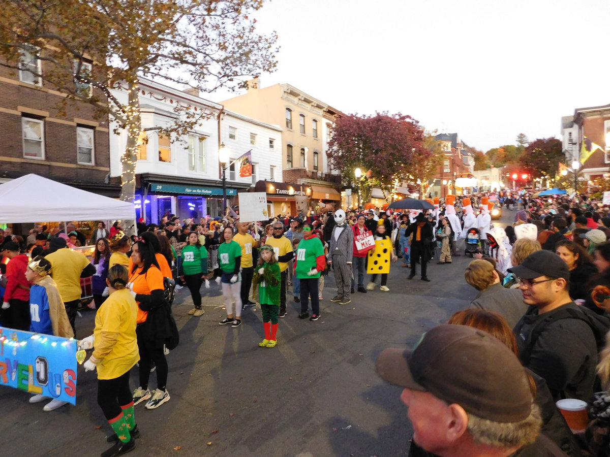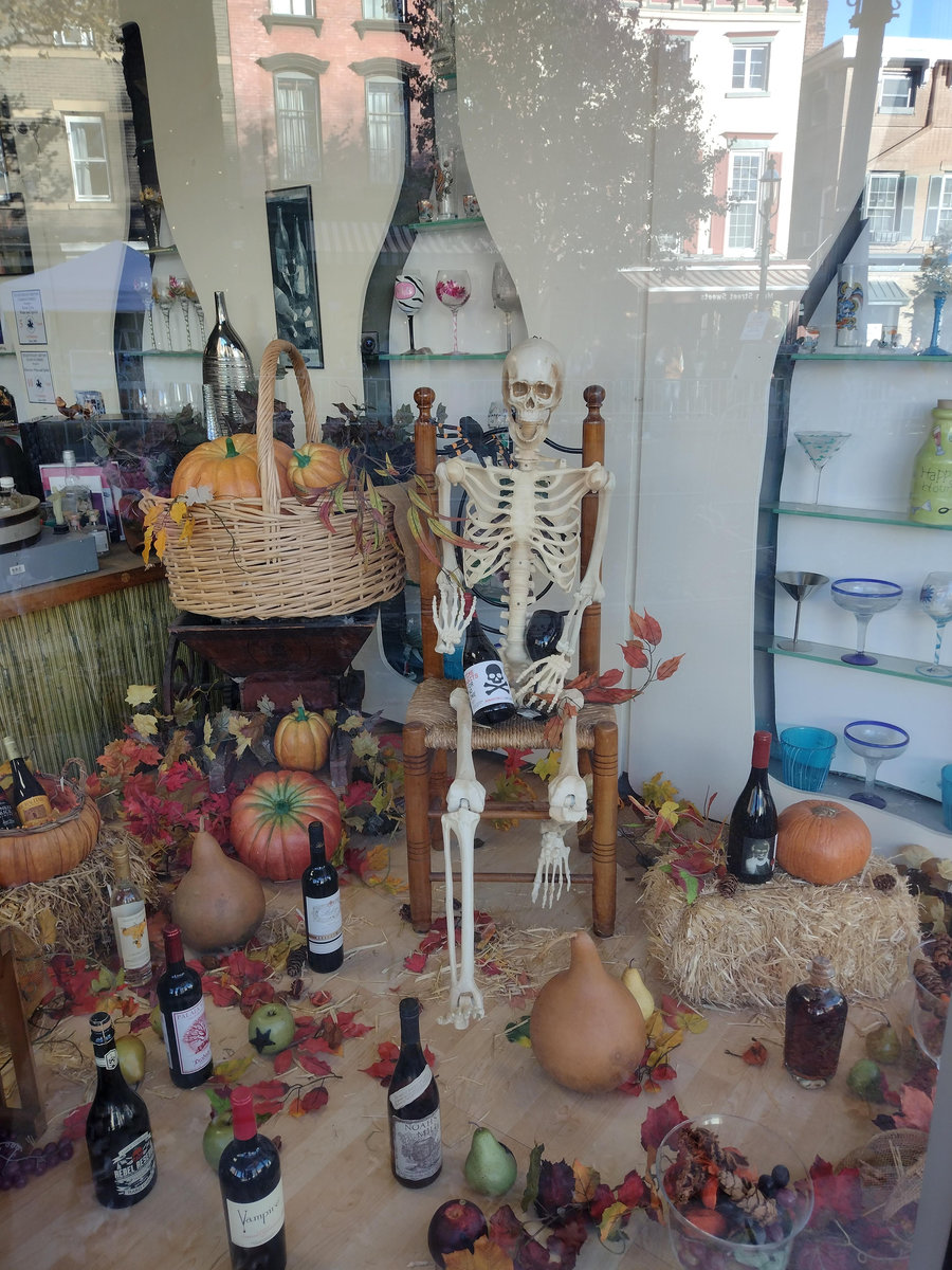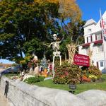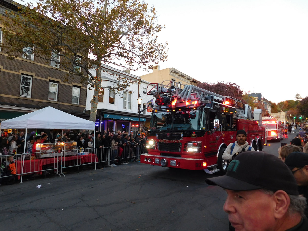 Když jsme opustili hřbitov ve Sleepy Hollow, kde se má podle legendy noc co noc prohánět bezhlavý jezdec mezi náhrobky, pokračovali jsme pak dolů do města. To už se pomalu začínalo chystat na nadcházející večerní průvod a s každou minutou přibývalo lidí v kostýmech. Najednou jste na každém kroku potkávali postavy z Marvelu, lidi převlečené za postavy z mexického Día de los Muertos, různé strašáky, duchy a sem tam i někoho, kdo vypadal, že utekl z gotického salónu nebo ze staré pohádky. Celé město bylo vyzdobené. Městské hodiny měly na sobě dýňového strašáka, některé domy i podniky nesly pavučiny, lebky a dýně snad všude. Před místním pohřebním ústavem Dwyer & Michael’s Funeral Home byl dokonce obří, asi třímetrový kostlivec a kolem něj hromada plastových náhrobků a dýní. A mezi nimi samozřejmě bezhlavý jezdec. Lidi se bavili, posedávali v kavárnách a pekárnách, kde se prodávaly halloweenské sladkosti, sušenky a lízátka ve tvaru lebek a dýní. Pomalu se stmívalo, hudba se rozléhala ulicemi a davy se začaly shromažďovat podél trasy průvodu. Jakmile se setmělo, průvod vyrazil. Fotky z něj mám bohužel jen z levného mobilu, takže nejsou kdovíjaké, ale pokusím se vybrat ty nejpoužitelnější. Atmosféra ale byla nezaměnitelná.