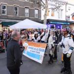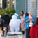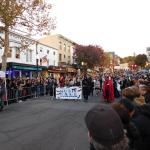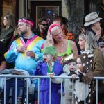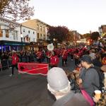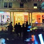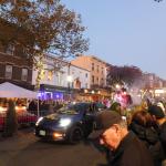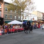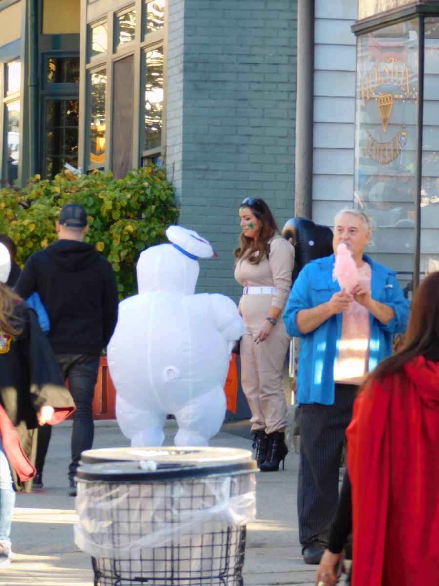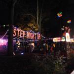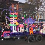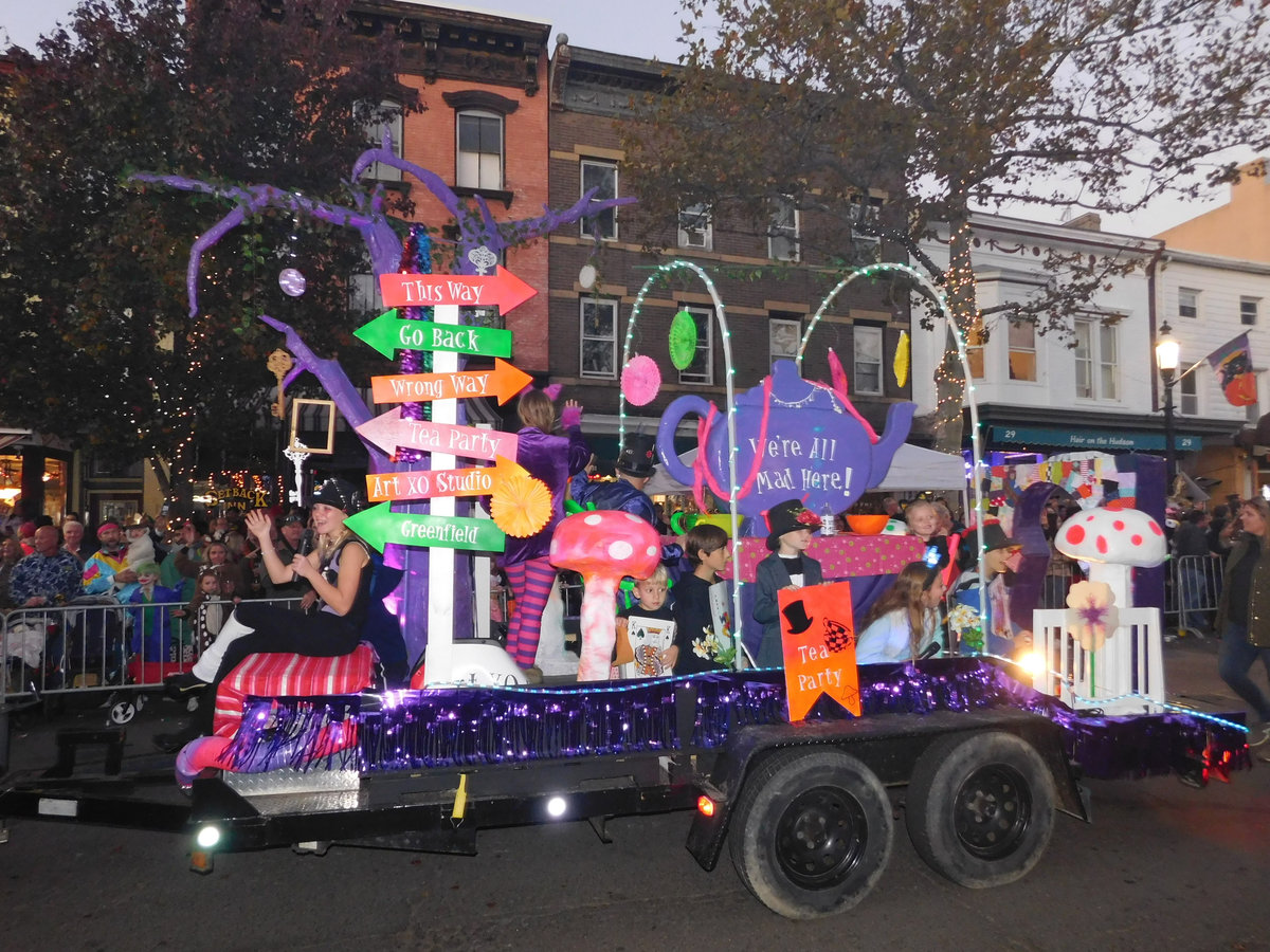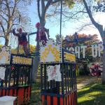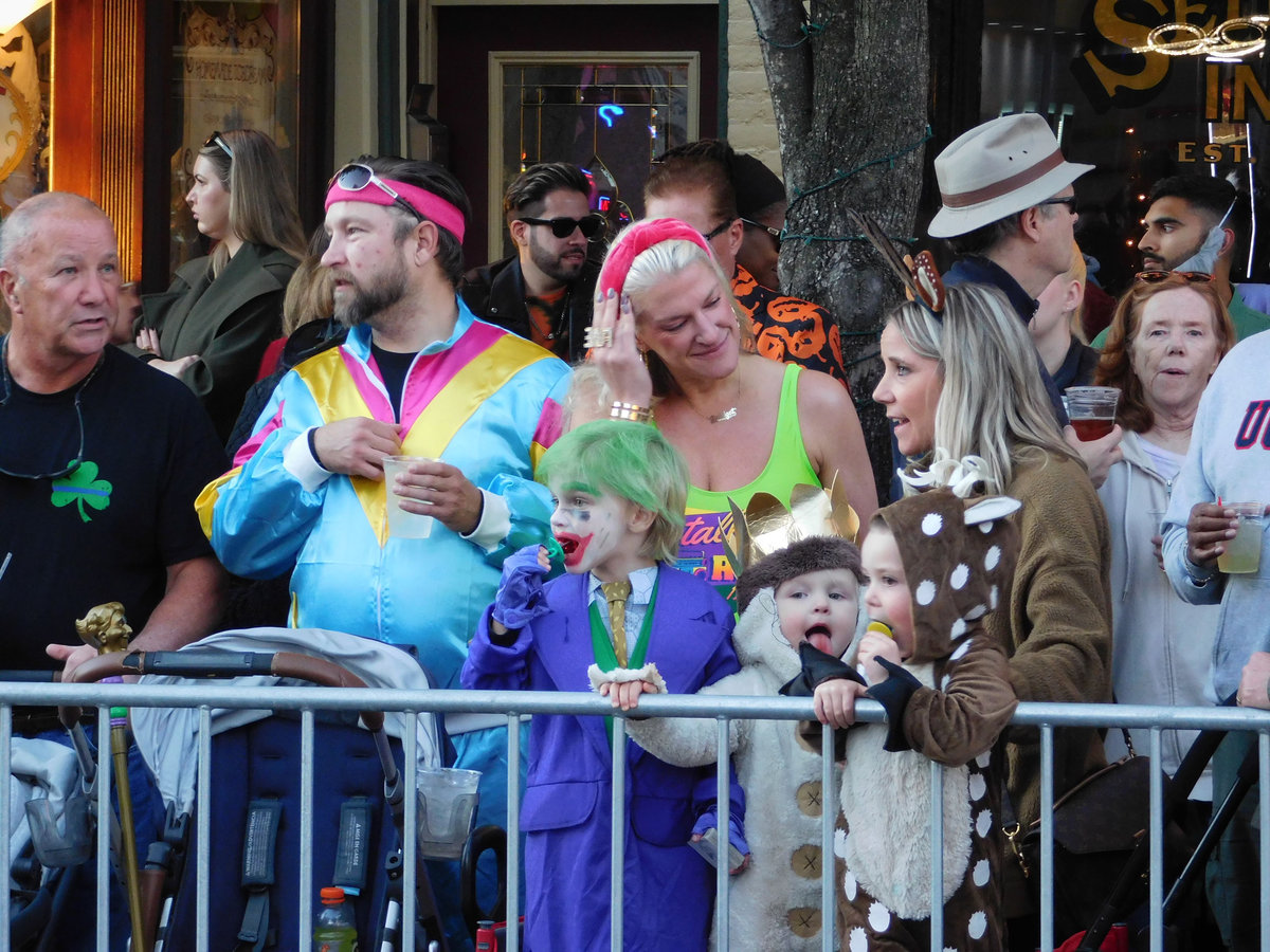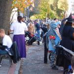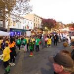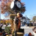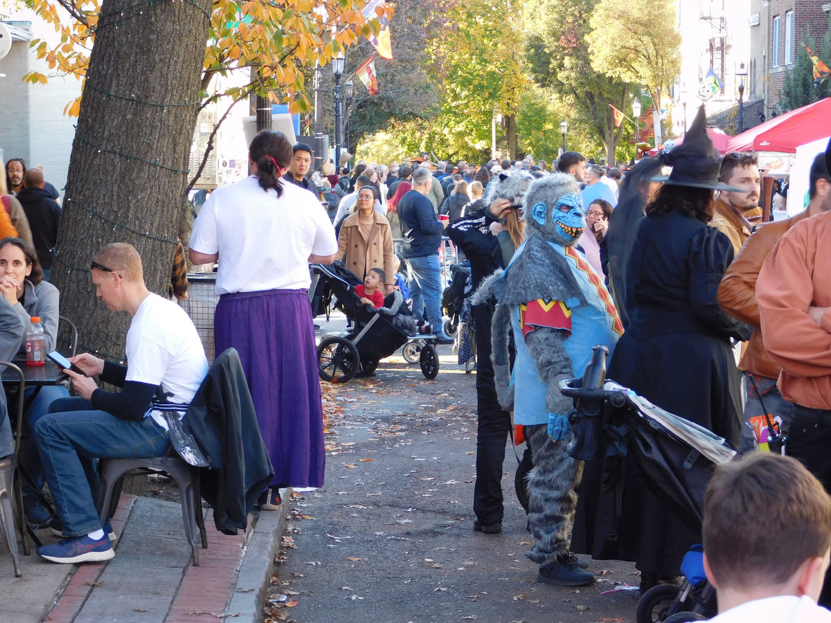 Když jsme opustili hřbitov ve Sleepy Hollow, kde se má podle legendy noc co noc prohánět bezhlavý jezdec mezi náhrobky, pokračovali jsme pak dolů do města. To už se pomalu začínalo chystat na nadcházející večerní průvod a s každou minutou přibývalo lidí v kostýmech. Najednou jste na každém kroku potkávali postavy z Marvelu, lidi převlečené za postavy z mexického Día de los Muertos, různé strašáky, duchy a sem tam i někoho, kdo vypadal, že utekl z gotického salónu nebo ze staré pohádky. Celé město bylo vyzdobené. Městské hodiny měly na sobě dýňového strašáka, některé domy i podniky nesly pavučiny, lebky a dýně snad všude. Před místním pohřebním ústavem Dwyer & Michael’s Funeral Home byl dokonce obří, asi třímetrový kostlivec a kolem něj hromada plastových náhrobků a dýní. A mezi nimi samozřejmě bezhlavý jezdec. Lidi se bavili, posedávali v kavárnách a pekárnách, kde se prodávaly halloweenské sladkosti, sušenky a lízátka ve tvaru lebek a dýní. Pomalu se stmívalo, hudba se rozléhala ulicemi a davy se začaly shromažďovat podél trasy průvodu. Jakmile se setmělo, průvod vyrazil. Fotky z něj mám bohužel jen z levného mobilu, takže nejsou kdovíjaké, ale pokusím se vybrat ty nejpoužitelnější. Atmosféra ale byla nezaměnitelná.