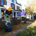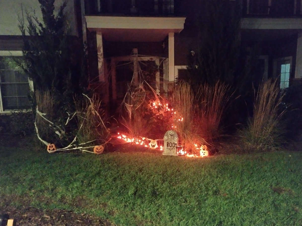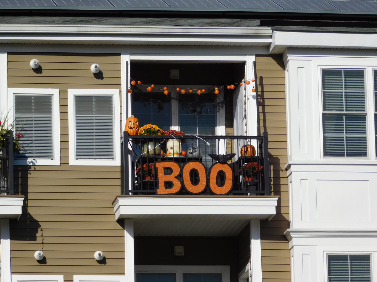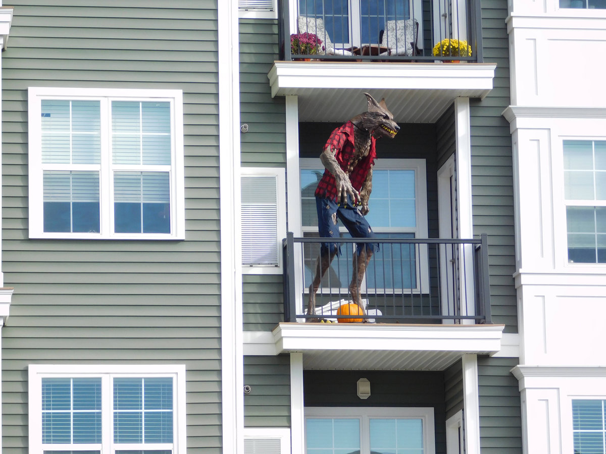 Problém tohohle zombíka byl, že to čidlo vás neregistrovalo vždy, takže jste nikdy nevěděli, jestli je nebo není zapnutý. A pak tu byly ty opravdu luxusní domy a sídla různých spolků, které se předháněly v extravaganci: kostlivci na kostlivých koních, domy s chapadly, hroby se jmény obyvatel či členů nebo obrovská klaunská hlava místo vchodu. Byly to atrakce, kde se na Halloween tvořily fronty dětí i dospělých, a my jsme se ani nesnažili dostat dovnitř, protože čekací doba k takovým dveřím byla klidně hodinová. Ani v bytových komplexech není o halloweenskou výzdobu nouze. Jasně, pronájmy bytů v Americe jsou přísné a majitelé vám obvykle nedovolí jen tak něco přibíjet nebo věšet, ale na Halloween se leccos odpustí. Některé bytové komplexy dokonce pořádají soutěže o nejhezčí balkon. U nás se třeba dalo hlasovat na stránkách komplexu a viděli jsme všechno od veselých oranžových světýlek až po dvouapůlmetrového vlkodlaka, který vypadal v noci opravdu děsivě, když jsem kolem něj venčil psa.
