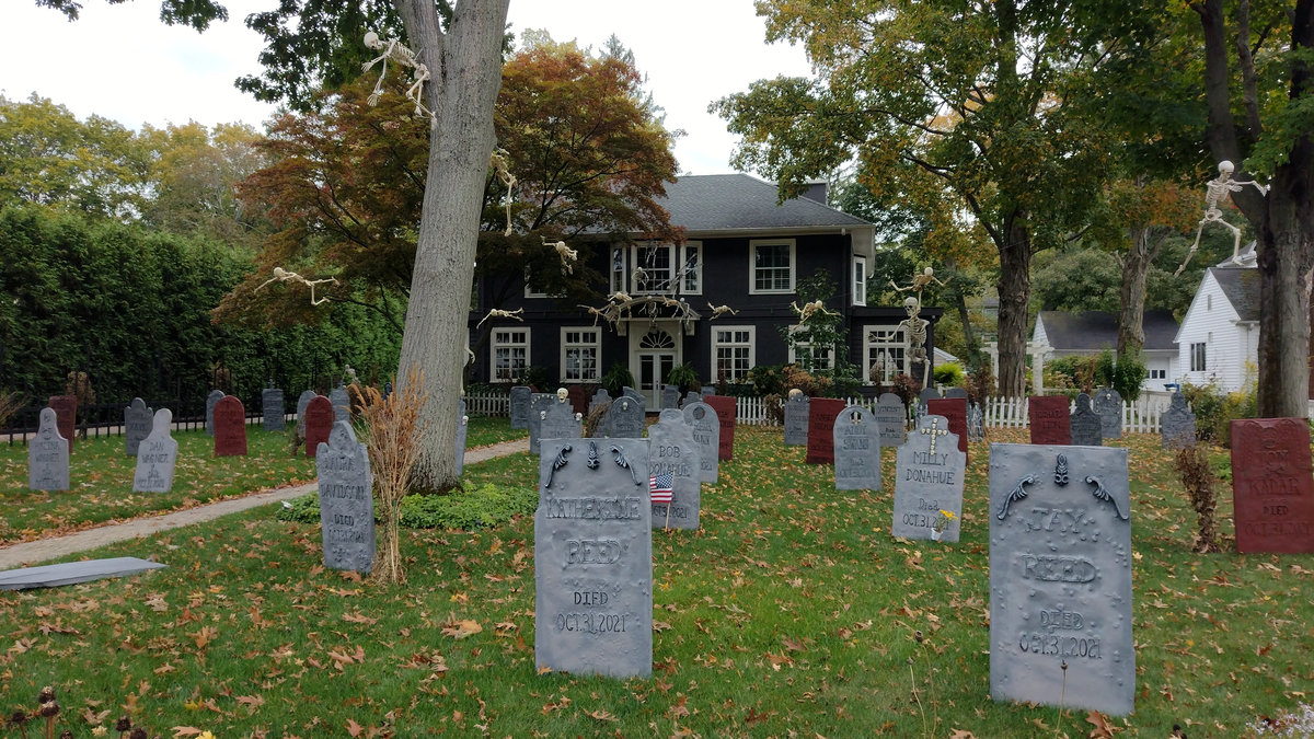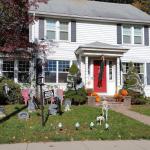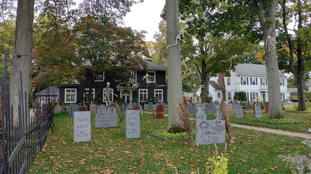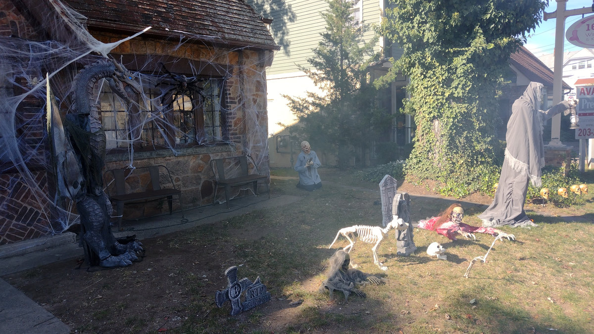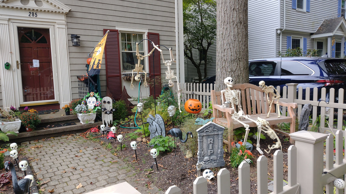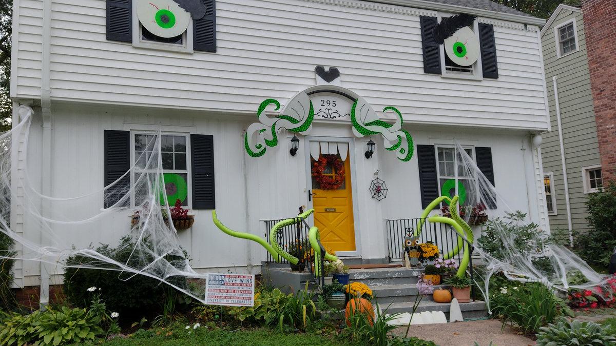 Od poloviny září se v naší čtvrti ve městě New Haven a Hamden v Nové Anglii s blížícím se Halloweenem objevovala na domech a kolem nich každým dnem nějaká nová dekorace. Jezdil jsem na nákupy na kole, protože ještě nebyla zima, a na procházky se psem, a každý den jsem hlásil ženě, kde přibylo něco nového! Občas jsem vyrážel do sousedství jen tak, právě na lov novinek. Někdy šlo o strašidelné kousky – kostry, náhrobky, pavouky a pavučiny, které pokrývaly keře a stromy, jindy naopak veselá barevná výzdoba. (Všimněte si že nikde nepíšu vkusná :D) Pavučiny se objevily snad na devadesáti procentech všech dekorací, zřejmě proto, že jsou levné a efektivní, a pokrývaly ve velkém keře, stromy i zdi domů. Strašidelnost obrovských pavouků a množství kostlivců občas narušil třeba strom ověšený barevnými plastovými dýněmi, které v noci svítily, nebo jasně zářivé oranžové dekorace s nápisy Spooky, Boo, Trick or Treat či Happy Halloween. Nezaostal ani kostel, jenž zdobilo pár halloweenských detailů a dáně před vchodem. Ano, i kostel tu mohl být tematicky ozdobený, takže náš moravský farář, který dětem rozkopával dýně jako dílo Satanovo, by tu byl asi dost v šoku.