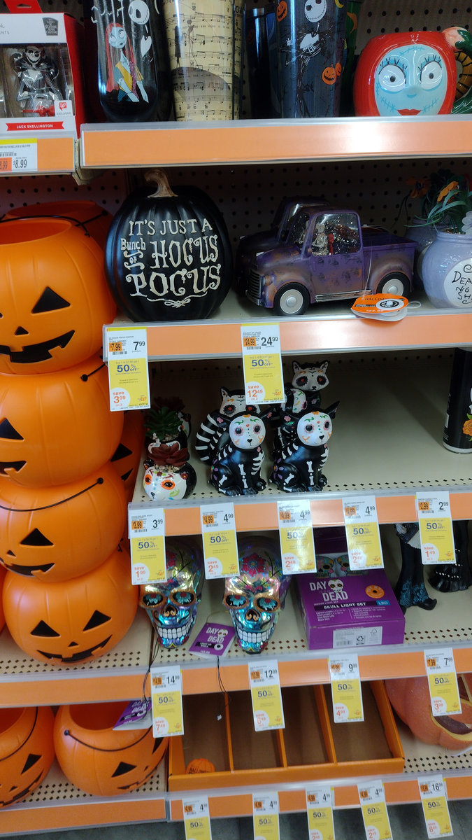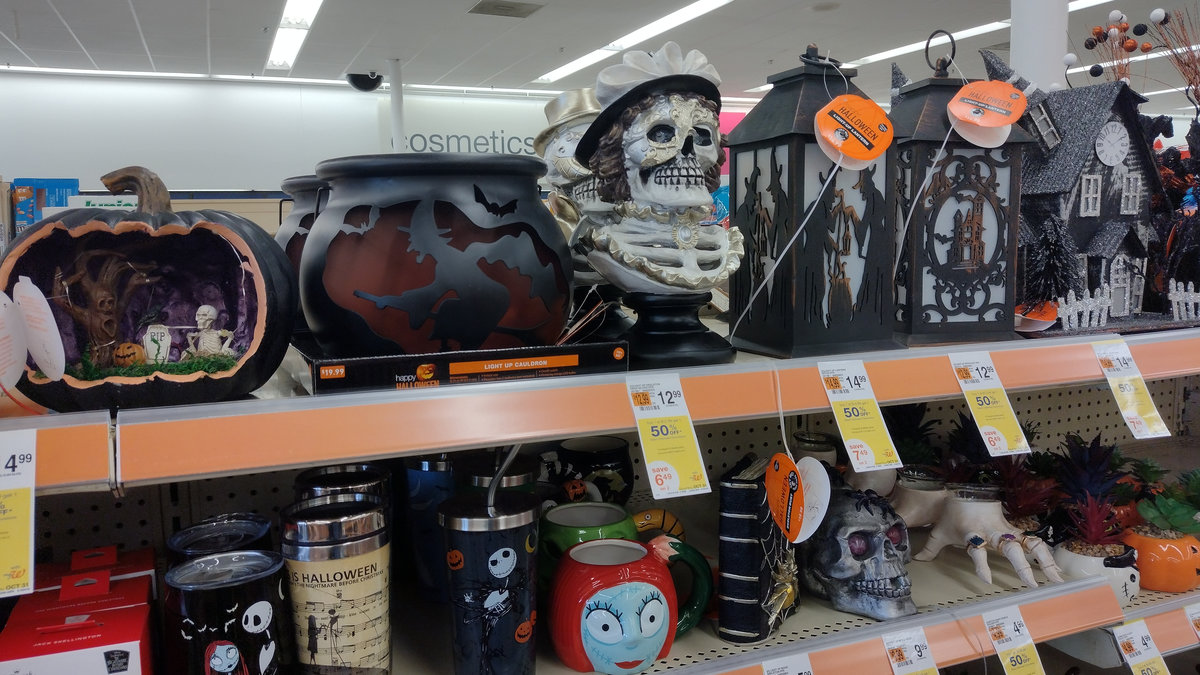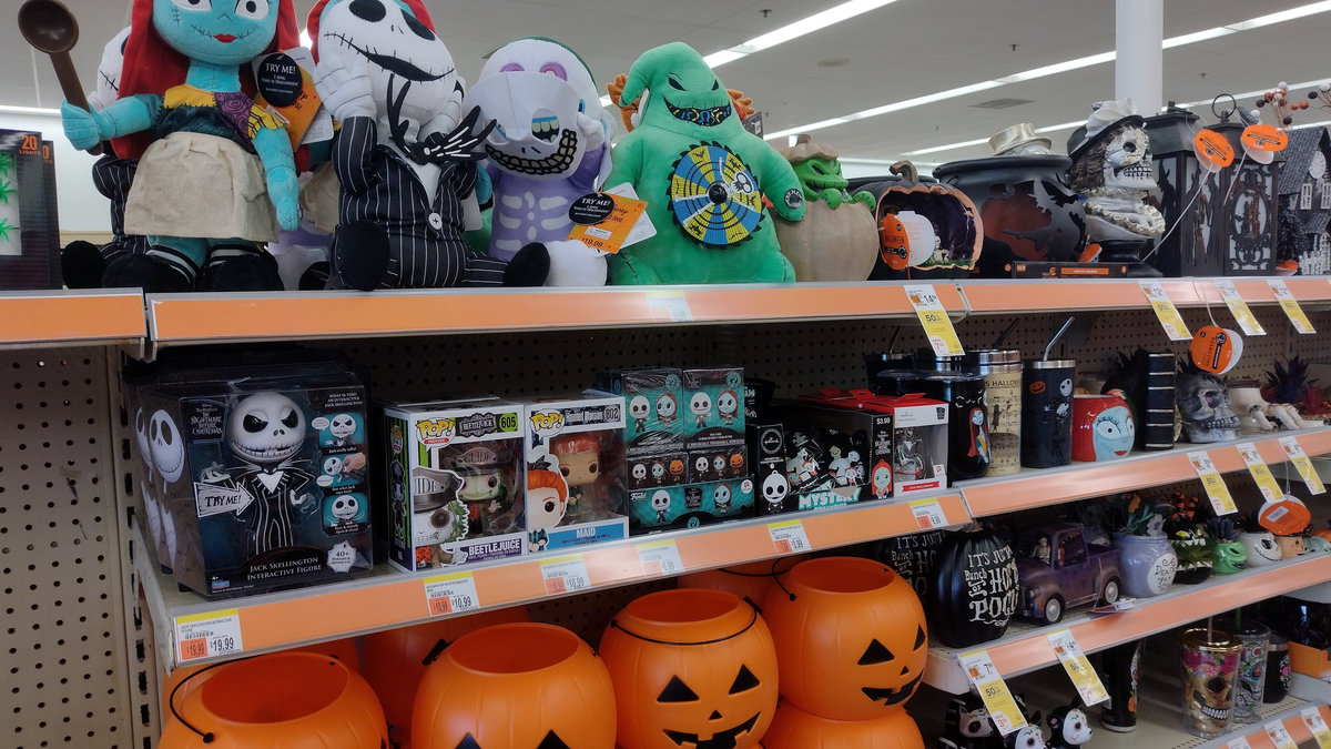Jakmile se blíží Halloween, obchody jako Target, Walmart, Price Rite nebo Aldi zaplaví tematické balíčky sladkostí. Letos jsme to ve větší míře mohli vidět i u nás, ale pořád to nemá ani zdaleka ten rozsah. Můžete si pořídit miniaturní verze sušenek Reese’s, malé Snickersky nebo hromadu balíčků M&M’s, které si děti pak mezi sebou vesele vyměňují. Z mojí zkušenosti teda sušenky Reese’s nechutnají skoro nikomu, ale i tak jsou všude :D. A nejen sladkosti. Obchody jsou plné halloweenských dekorací, takže kdekoliv koupíte kostlivce v životní velikosti, hrníčky s lebkami, masky nebo různé strašidelné postavičky. V Home Depotu, ale i v Walmartu a Targetu koupíte pavoučí sítě ve spreji, plastové dýně, nafukovací strašidla a spoustu dalšího potřebného bordelu. A pak je tu Dollar Store, kde jsou ty největší šmejdy na jedno použití pro opravdu chudou část lidí, co chce přesto tenhle svátek taky slavit. Nutno poznamenat, že i tam narazíte na balíčky minisladkostí, které jsou asi v pořádku, jen prostě ještě menší. Část dekorací je univerzální, ale spousta je navázaná na americké filmy a seriály. Třeba Noční můra před Vánocemi je tu hit, takže si můžete pořídit hrnky, květináče nebo ozdoby s Jackem Skellingtonem a jeho partou. A pak jsou tu farmářské trhy a výprodeje v Goodwillu nebo Armádě spásy. Farmáři v okolí vyvěsí cedule, že prodávají dýně, dýňové koláče a pořádají dýňové slavnosti. Dýňové koření se sype každou skulinou a dýňové latté a dýňový sirup teče proudem. Goodwill a Armáda spásy pak vytáhnou všechno oranžové a strašidelné, co se za rok nashromáždilo, a prodávají to za pár drobných. Mnohdy jsou to i původně docela drahé dekorace, které se jen někomu nechtělo vláčet při stěhování přes půlku Států.