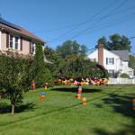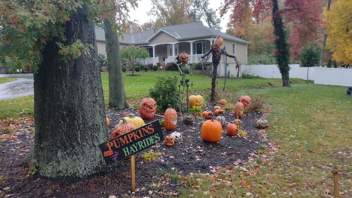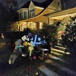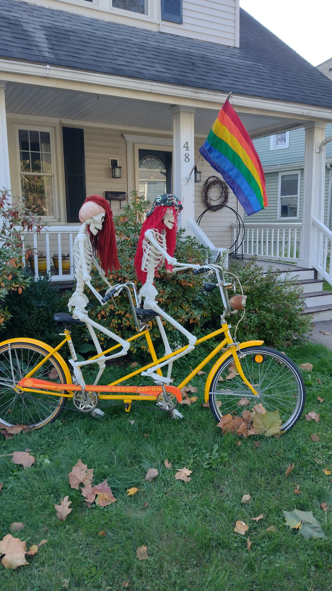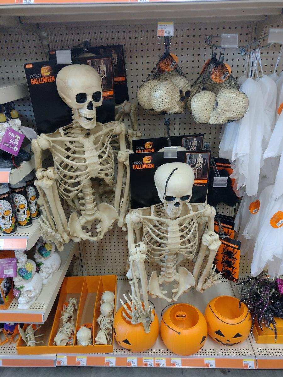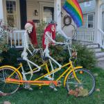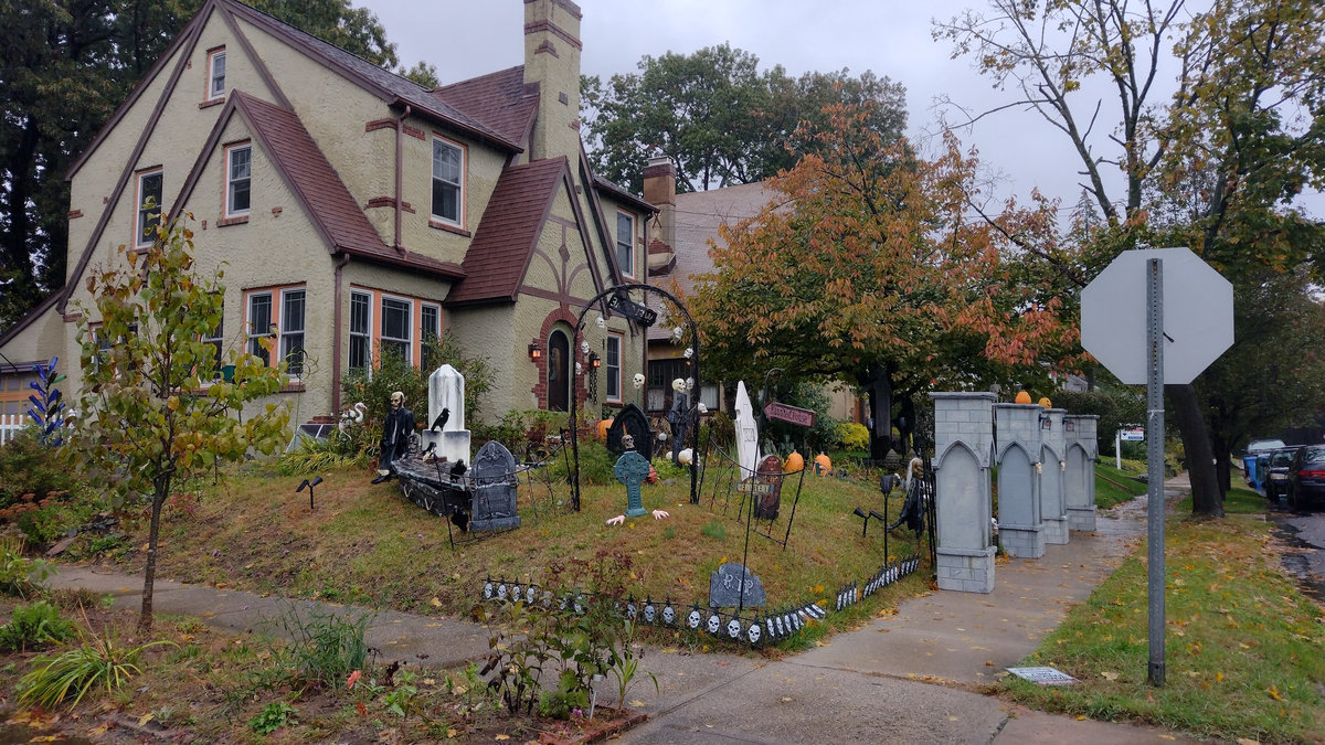 Někdo to pojal střídmě a postavil před dům dvě svítící dýně, jiní, protože v USA je zvykem nějakým způsobem projevit svůj názor i v rámci sousedství :D, doplnili LGBT+ vlajku LGBT+ kostlivci. Skutečně, když projedete kteroukoli čtvrť, najdete nepřebernou paletu vlajek a samozřejmě se to propisuje jak do halloweenské, tak potom do vánoční výzdoby. V každém sousedství kolem nás se našly i domy hrůzy ověšené spoustou lezoucích kostlivců, nějak nasvícené, ale třeba i doslova zasypané levným kýčem v enormním množství. Jedna veterinární ordinace měla před vchodem animatronického draka chrlícího dým a zombii, co vyskočila, pokud jste šli kolem, takže jste minimálně poprvé uskočili do silnice pod kola Fordu F-350 :D.