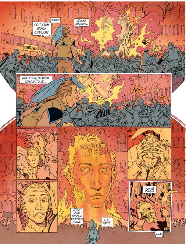Samozřejmě nebylo by dobrého komiksu bez dobrého výtvarníka. A Moebius (vlastním jménem Jean Giraud) je výtvarník víc než dobrý. Známý (tedy nikoli u nás) je hlavně westernovým komiksem Blueberry, kterého vyšlo už osmadvacet knih, ale proslavil se hlavně originálně pojatými díly z oboru sci-fi. Ať už používá asketickou jemnou linku nebo šrafuje a prokresluje jako divý, jeho obrázky jsou citlivé a působivé. Stejně jako Jodorowskyho, ani Moebiova fantazie taky zjevně nemá hranic a snové scenérie i uhrančivé abstrakce skvěle korespondují s příběhem. Je třeba zmínit, že v našem vydání je použita původní barevnost. Takže se vám možná leccos bude zdát trochu pobledlé nebo naopak příliš křiklavé. To je ale problém v podstatě pouze první části. Rozhodně je výsledný dojem lepší než z verze s novým coloringem vytvořeným pro americké vydání (schválně si zkuste vygooglit), který k Moebiovu stylu prostě nesedí.