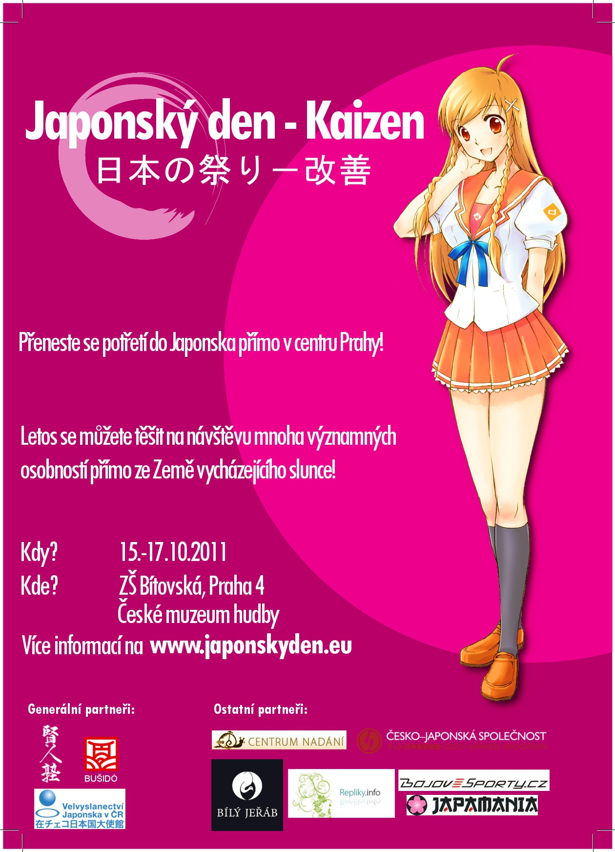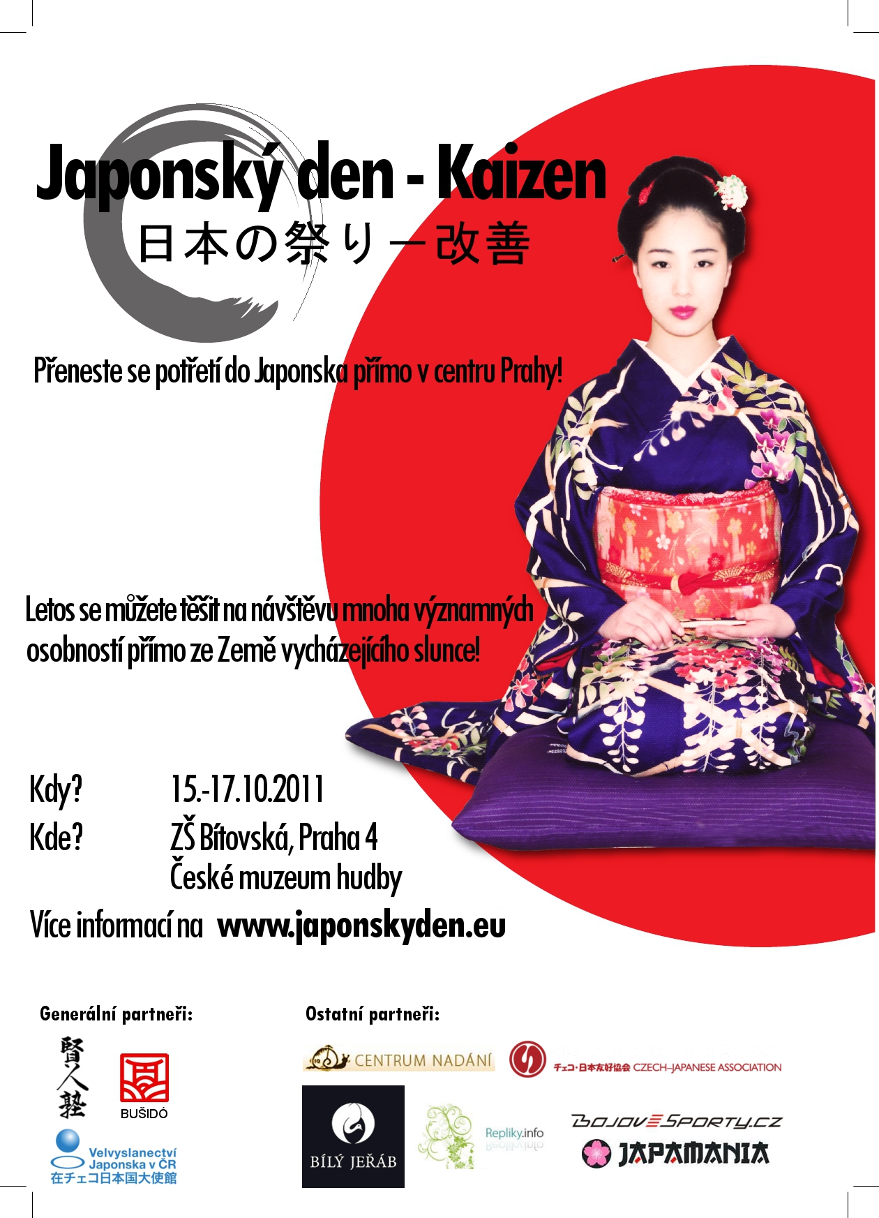 Japonský den - Kaizen čeká třetí ročník, tentokrát 15. října 2011 v Praze. Akce si dlouhodobě klade za cíl propagaci Japonska a japonské kultury bez pozlátek a předsudků, v co nejkomplexnější podobě a to jak pro běžné smrtelníky, tak vousatou odbornou veřejnost. Díky spolupráci České republiky i Japonska budou letošní ročník formou vystoupení, přednášek a workshopů prezentovat držitelé vysokých mistrovských stupňů a přední experti v rámci tradičních japonských umění.