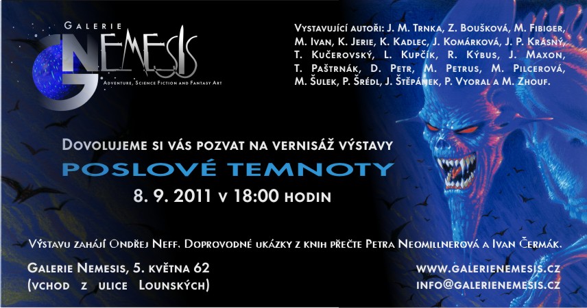 Praha, 29. srpna 2011 – Výstava toho nejlepšího z československé výtvarné tvorby v oblasti sci-fi, fantasy a dobrodružství začíná 8. září 2011 v pražské Galerii Nemesis. Vernisáž projektu s názvem POSLOVÉ TEMNOTY zahájí v 18 hodin guru české fantastiky Ondřej Neff. Jako hosta vernisáže pozvali organizátoři výstavy Petru Neomillnerovou, jednu z nejpopulárnějších spisovatelek české fantastiky. Návštěvníci budou moci shlédnout výbor z děl různých autorů do konce září letošního roku.