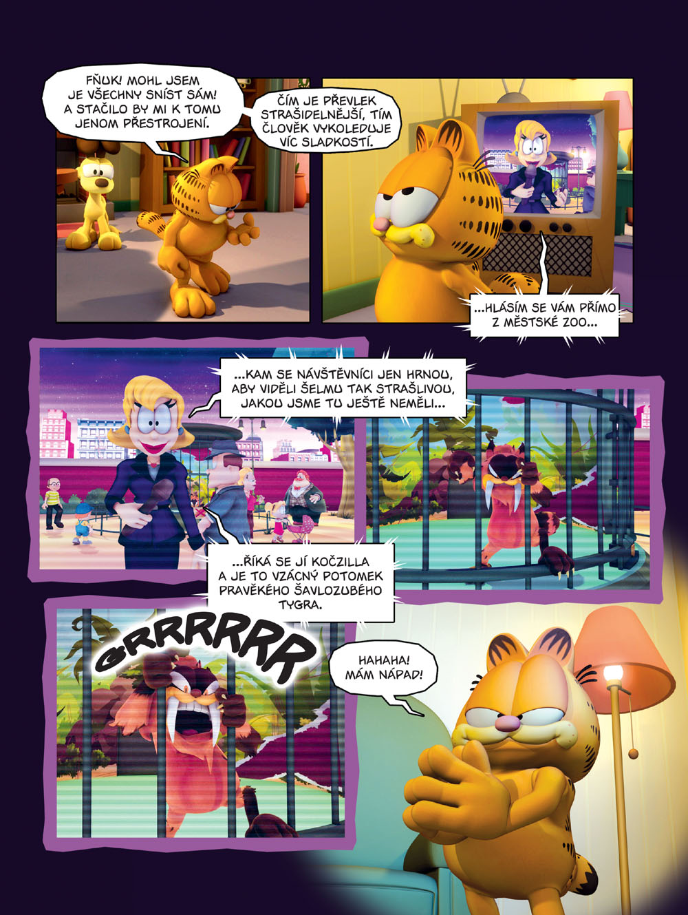 Ve velké a barevné knize inspirované i u nás známým a úspěšným televizním seriálem najdete hned několik delších dobrodružství nejslavnějšího kocoura světa! Garfield se – přes své přesvědčení – zúčastní soutěže krásy (co by člověk... tedy kocour... neudělal pro lasagne), spletou si ho s ďábelskou kočkou Kočzillou, zaplete se do nelítostného souboje dvou firem na výrobu pizzy a dokonce je sadistickým Nermalem přinucen sledovat krasobruslení!