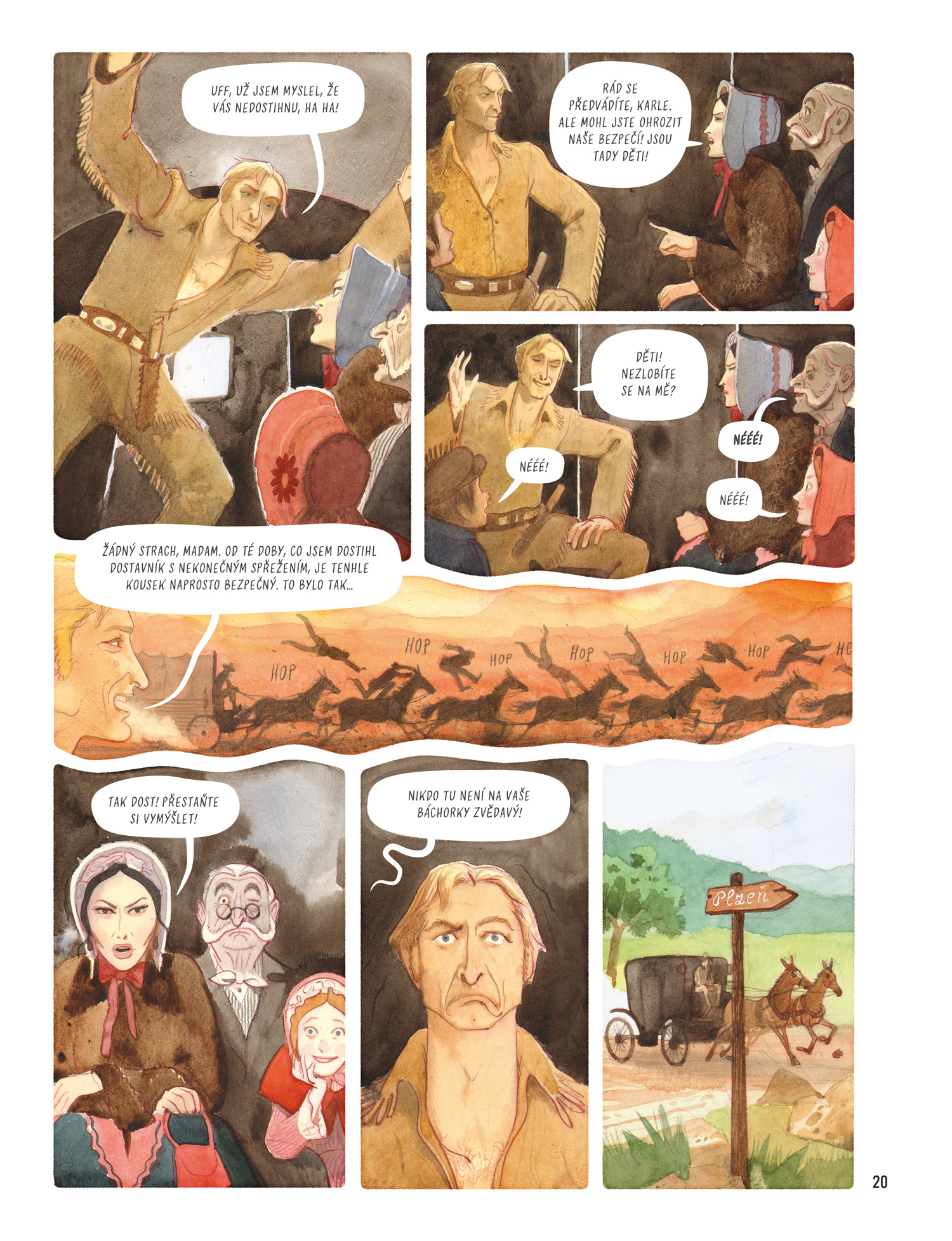 V románu českého spisovatele Stanislava Komárka Mandaríni se objevují ukázky z neznámého a v češtině nikdy nevydaného románu Karla Maye Ve stínu šumavských hvozdů. S. Komárek z tohoto díla, unikátního jednak tím, že je u nás zcela neznámé, a jednak tím, že se dobrodružství Mayova alter ega Old Shatterhanda alias Kara Ben Nemsího tentokrát odehrává v šumavském pohraničí, cituje pouze krátké fragmenty. Scenáristé Džian Baban a Vojtěch Mašek z tvůrčí skupiny Monstrkabaret Freda Brunolda a výtvarník Jiří Grus neměli Mayův originál k dispozici, ale jejich záměrem bylo na základě těchto fragmentů na ploše komiksu děj celého románu zrekonstruovat. Výsledným tvarem je dobrodružný barevný obrázkový příběh. Slavný Old Shatterhand zde tentokrát nečelí hordám po zuby ozbrojených lupičských tlup, nýbrž zdánlivě bezbranné, chladnokrevné, ledově krásné femme fatale Barboře. Vážení čtenáři a čtenářky si jistě dovedou živě představit, v jak strašném nebezpečí se tento nevinný a čestný muž tentokrát ocitá... Držme mu palce, aby z něj bez úhony vyvázl.