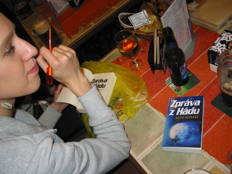 (První foto autorky ze zadní stránky knihy, druhé ze křtu ve smíchovské knihovně, třetí ze spontánní autogramiády v hospůdce U kruhu)