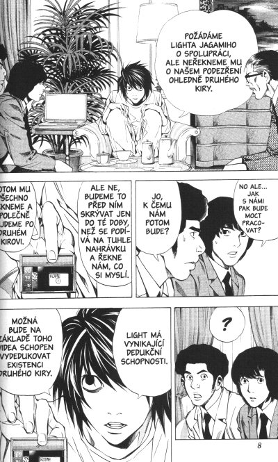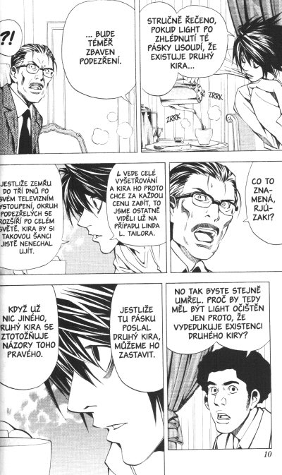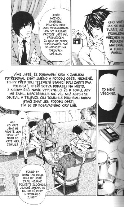 Na scéně se objevil druhý Kira a jak L, tak Light ho chtějí kontaktovat jako první. L, protože je to jeho práce, a Lighta mimo to zajímá, kdo že mu to fušuje do řemesla a jestli by náhodou nešel nějak využít. Celá první část knihy se nám tedy nese opět ve stylu hry na kočku a myš, přičemž je dost pravděpodobné, že v druhé části budou myši dvě. Jenže chyba lávky. Druhý Kira, v kůži krásné Misy Amane, se nenechá polapit ani jedním, ani druhým detektivem a Lighta sama vyhledá, jen aby se ukázalo, že ač je Misa naivní, bude Lightovi možná mnohem nebezpečnější než L a bude mnohem spíše hrát roli druhého lovce než kořisti. Nabídne mu totiž sama sebe, aby ji využil, k čemu uzná za vhodné, ale na oplátku s ní Light musí začít chodit. V tomto okamžiku se z Lighta vyklube zřejmě gay, neboť jinak si nedokážu vysvětlit, proč nezahodí deník a neodkráčí s Misou do západu slunce. Každopádně nabídka, Lightovy vlastní chyby a Misino naivní chování Lightovi zkomlikuje situaci tak, že bude muset rozehrát partii, o které sám neví, jak může dopadnout, a musí balancovat na ostří laserem třikrát broušeného nože.