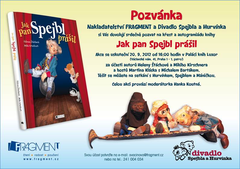 Praha, 13. září 2012 – Spejbl a Hurvínek baví dětské i dospělé publikum již po celé generace. Divadlo S+H bylo založeno v roce 1930 a od té doby uvedlo přes 250 původních her! Podle jedné z aktuálně uváděných her připravilo Nakladatelství Fragment ve spolupráci s divadlem její knižní zpracování. Titul Jak pan Spejbl prášil vyjde již 17. září!
