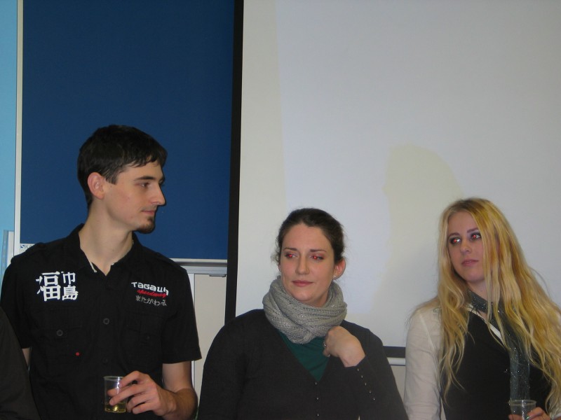 A bylo osm večer a byl jsem totálně zničen. Jak tělesně, tak i duševně. Odebral jsem se tedy do čajovny, opět za čajem a podvečerními zákusky. Zatímco včera jsem seděl ve vedlejší místnosti u stolu, teď jsem sebou plácnul na matrace na zemi. A bylo dobře, čaj plnil mé útroby, elektrické mlno baterii foťáčku, kolem uší plynuly rozhovory přítomných, občas připlul nabídnutý perník. Inhaloval jsem přátelskou atmosféru, nechal se prostupovat prostorem a sám se rozprostraňoval do všech rohů Prvního "extra patra", ohříván čajovou konvicí a naplňován energií, vanoucí Modrou školou. Po hodině jsem byl připraven absolvovat závěrečný hřebík PragofFFestu. Já, i canonek. Ten byl včera celý rozžhavený, neb jsem jím i dokumentačně filmoval. Vyčerpal jsem všechny tři funkční baterie, co jsem měl s sebou. Tady zmíním, že con začíná už ve čtvrtek, kdy se rozjíždí, a končí až v neděli. Ale absolvovat celý bych ho nezvládl. Avšak po hodině v čajovně jsem byl připraven alespoň na závěrečnou dvouhoďku.