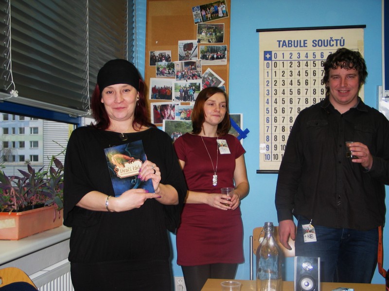 Krátký přesun, a byl jsem znovu na literární linii Pevnost v místnosti 106. Hana Fruhwirtová z nakladatelství Zoner Press zde uváděla křest sbírky povídek mladých českých autorů (z dorazivšího autorského zastoupení tedy spíše autorek). Sbírka obsahuje deset nejlepších povídek ze soutěže Dračí řád, a tak se i jmenuje – s podtitulem "Času navzdory". Svazek doplnilo pět nejlepších povídek ze soutěže O dračí oko a jedna z klávesnice profesionálky Karoliny Francové. Chvályhodná snaha nakladatelství k podpoře začínajících autorů, které nic tak nepotěší, jako "skutečná kniha", nabízená ve "skutečných knihkupectvích". A, v trendu doby, zároveň i jako e-book. Ale nemyslete si, že příliš ušetříte – to prostě nejde (poměr cen je 149/129 Kč). Kmotrou byla další profesionálka, Petra Neomillnerová, která se zdržela po své předcházející Nálevně literární inspirace. (Omlouvám se zpětně Petře – exoplanety mě zlákaly více, a inspirace mám sám na rozdávání – spíš bych potřeboval radu, jak přikovat zadek k židli před počítačem.) Křtilo se šampaňským, nějaké zbylo i pro neautorky, takže nálada byla dobrá.