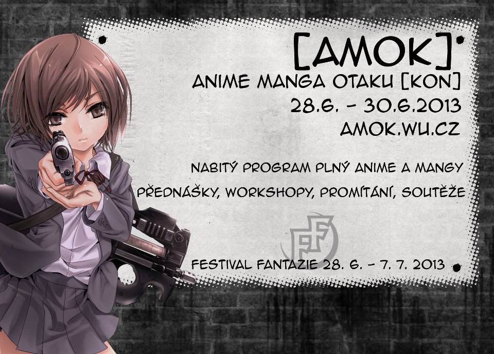 Já bych vás však rád pozval na linii AMOK, kterou pořádám s mým skvělým týmem přednášejících. Je to linie zaměřená na anime a mangu, tedy něco pro otaku. Naše linie běží celý první víkend Festivalu fantazie a dozvíte se tam spoustu nových a zajímavých věcí. Ať už za sebou máte desítky hodin anime, či jste neviděli ani jeden díl, určitě vás zaujme některá z našich přednášek. Těšit se můžete letos taky na workshop kresby v manga stylu.