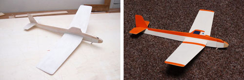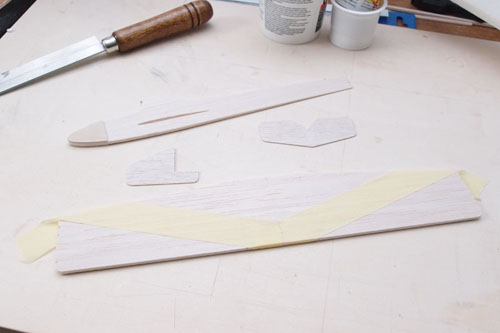 Takže, pokud je vybroušeno a máme zkontrolováno, že křídlo pasuje do trupu, rozřízneme ho a slepíme do vzepětí dle výkresu.