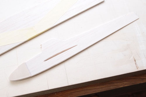 Ocasní plochy a díly čumáku pouze přebrousíme a dáme stranou. V trupu vyřízneme otvor pro křídlo a zátěž. Za odtokovou hranou křídla se trup postupně zužuje na tloušťku 1mm, takže vezmeme brusný papír a zbrousíme.