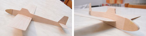 - Pak potřebujete kousíček překližky tloušťky 1mm – použijete ji na nos letadla, který jí zpevníte a pomůže Vám vytvořit kapsičku na zátěž; umím si představit, že čumák místo z překližky vyříznete třeba z plastového kelímku