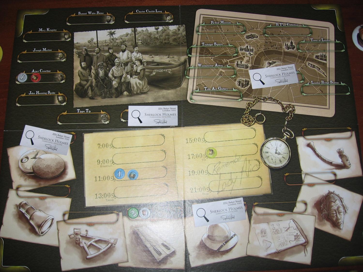 Herní materiál je velice pěkně graficky zpracovaný, pomáhá vžít se do herního tématu a zobrazuje všechny potřebné indicie. Kroužkový zápisník, karty představující jednotlivé nápovědy, žetony dedukcí, vizitky Sherlocka Holmese a složky s verdikty - po rozdělení potřebného materiálu čeká už jen a jen zábava.