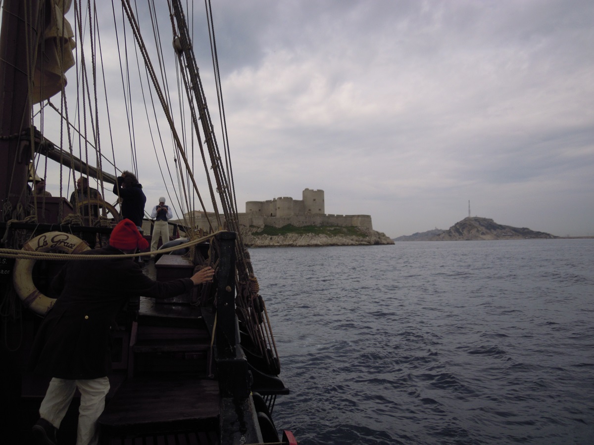Návrat do Itálie se odehrává na podobné trase. V úterý jsme ráno kotvili v laguně v ústí Rhóny, odpoledne v Marseille poblíž pevnosti Saint Jean (kde kdysi sídlila Cizinecká legie, zapsala se do našich vojenských dějin a prošla i Velinského antarktickým cyklem) a večer jsme na chvíli zastavili před Dumasem proslavenou pevností If. V noci jsme se na motor přesunuli k Toulonu, kde jsme u pláže strávili středeční dopoledne. Došlo na koupání, pár lidí se vydalo na rychlý výlet do města a zbytek se na palubě pokoušel zcivilizovat za úvah, jestli by se Francouzi po první ráně z děla tradičně vzdali, nebo neméně tradičně potopili. Fregata zakotvená u mola na druhém konci zátoky byla zjevně ve stavu, že by ji poslalo ke dnu bouchnutí pytlíku od svačiny.