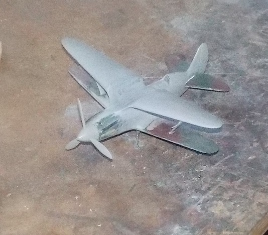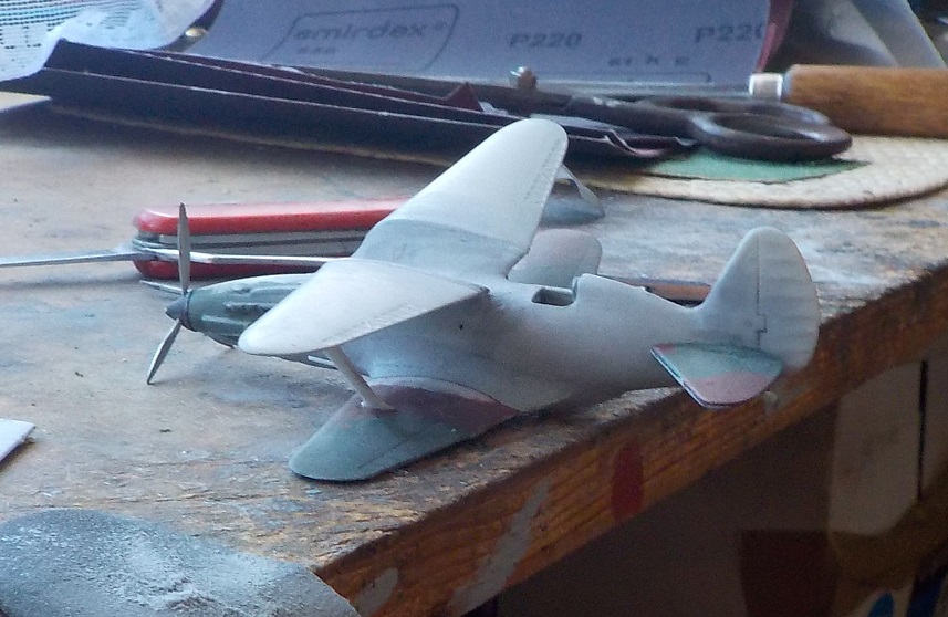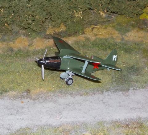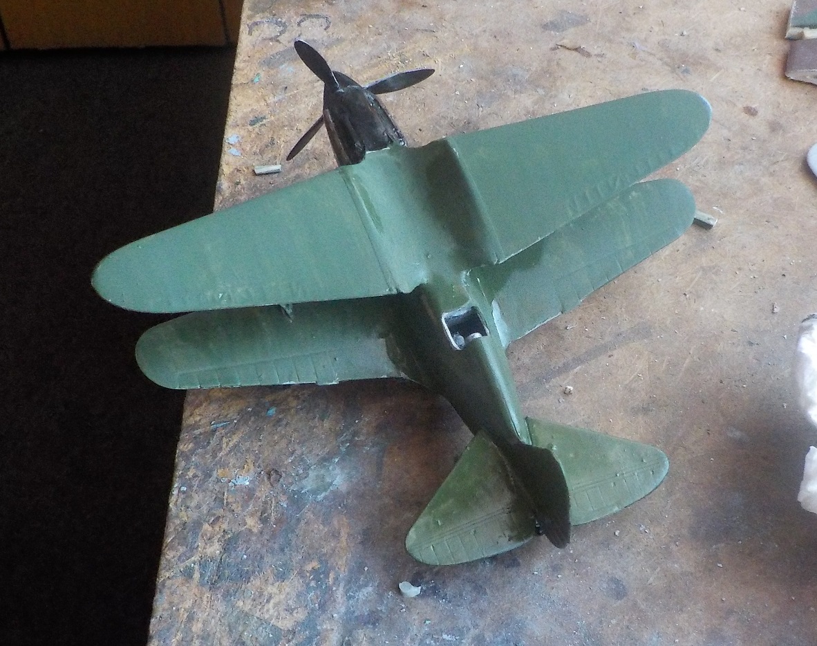 Nastala fáze barvení. Jaký ale zvolit nátěr? Nejprve jsem zkusil klasický prototypový, který byl u Polikarpova běžný – černý motor, zbytek kov a hliníkový nátěr. To ale nevypadalo dobře. Model představuje víceméně tvarovou studii a povrch tudíž není členěn žádnou paneláží, není ani známo přesné složení a dělení povrchu, vyjma ovládacích ploch. Nakonec tedy přišla ke slovu vojenská klasika – kombinace modré na spodních a zelené na horních plochách. Vojenské zbarvení se stalo koncem roku 1940 obvyklým schématem i u prototypů, které do té doby hýřily nejrůznějšími barvami a většinou postrádaly výsostné znaky. Jen motor jsem nechal v původní černé. Výsostné znaky – černě lemované rudé hvězdy (toho času obvyklého typu), jsem použil z MiGu. Jejich rozmístění odpovídá předválečnému sovětskému standardu – na trupu za kabinou, na horních křídlech zhora, na dolních zespodu. Při nanášení obtisků jsem použil obvyklý postup a chemii. Stavbu zajímavého projektu jsem zakončil lehkou paginací a zvýrazněním spár ovládacích ploch fixy od Gunze.