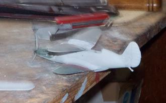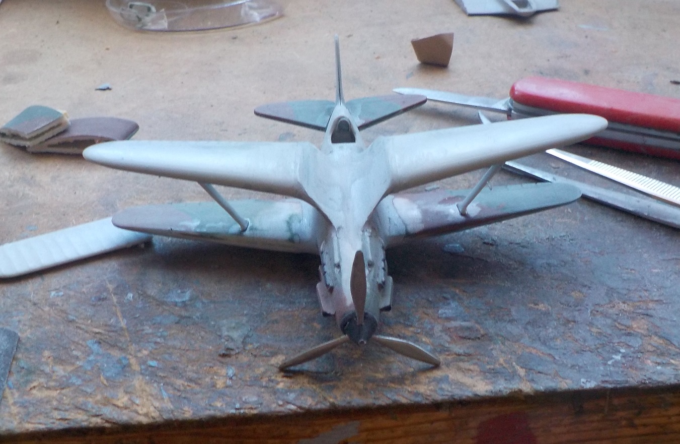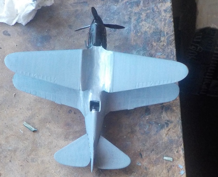 Ukázalo se, že nový trup je proti náčrtům neuvěřitelně dlouhý a podvozek se tak octl někde v polovině jeho délky. Neseděly ani proporce přídě. Poměřil jsem trup MiGu od HobbyBosse s rostoucí I-170, vzal do ruky pilu a odřízl příď na úrovni přední hrany výfuků. Opadaly při tom i nějaké lapače, ale to nebylo na škodu. Zkompletoval jsem příď „houbybosího“ stroje a odřízl od ní přepážku s otvorem pro vrtuli. Vzniklá „placka“ téměř přesně sedla na zbytek přídě vznikající stíhačky. Odvrtal jsem do kuželu otvor pro kanón, zkompletoval vrtuli, osadil ji na „placku“ a celek nalepil na trup. Spoj stačilo jen decentně přetmelit a zabrousit do hladka. Ještě jednou jsem přebrousil trup. Doplnil jsem na podvozek chybějící „protistřihové nůžky“, nalepil kola a kryty.