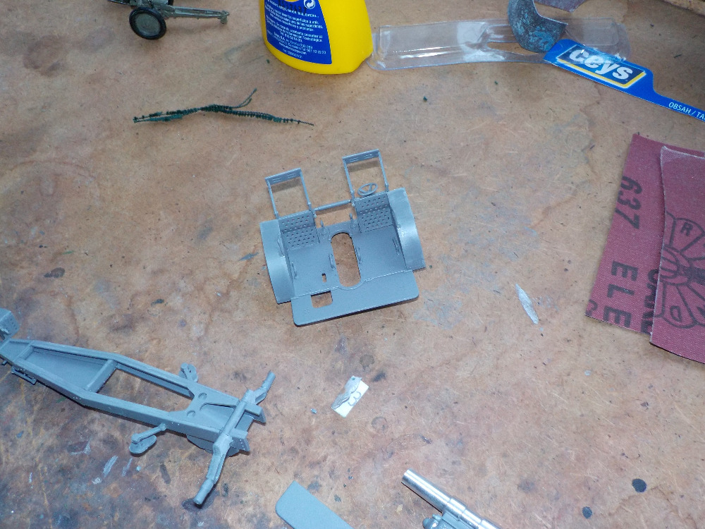 Poslední podsestavu tvoří štít se sedačkami. Základ (vlastní štít a blatníky) jde dohromady bez problémů, sestava rámů, sedaček a brzd je ale velmi náročná na dodržení geometrie – dobře sedící blatníky jsou sice kvalitní vodítko, ale samy o sobě nestačí. Proti dílům stavebnice je třeba na vnitřní stranu štítu doplnit krytky otvorů. Nejsnáze je vyrobíme z tenké hliníkové fólie (miska čajové svíčky či obal uzávěru od lepšího vína), nebo zbytků leptů. Krytky jsou dvě – malá dole na štítu – zde stačí malý pásek s naťuknutým náznakem šroubu, a velká, kryjící velký otvor pro zaměřovač. Starší verze krytu se posouvala nahoru a dolů na dvou svislých prutech, novější varianta „jezdila“ v navařených či nanýtovaných plechových kolejničkách. Ty jsem napodobil pásky za zbytků leptu. Jiné řešení by představovalo odříznutí horní části štítu a její nalepení do sklopené přepravní polohy (šikmo dozadu). To by znamenalo zavřít horní průzor a upravit úchyty horního dílu štítu. Samozřejmě lze celý horní díl štítu modifikovat na dělenou verzi (vyžaduje to výrobu řady nových dílů), krytku horního otvoru ve štítu udělat posuvnou na prutech a celou partii „rozhýbat“ podle dobových fotek. S laskavou pomocí ostré čepele a smirku je možno upravit i opěrky pro nohy vezené obsluhy – odříznout je těsně pod šroubem, zabrousit řez do kulata a nalepit je na nosníky ve vyklopené poloze – tak se vyskytovaly při střelbě, bylo-li dělo umístěno v okopu.