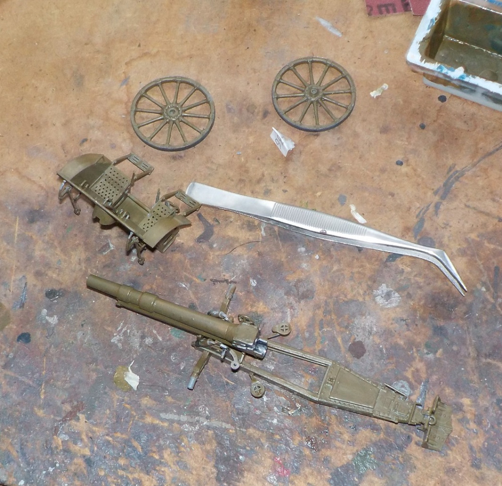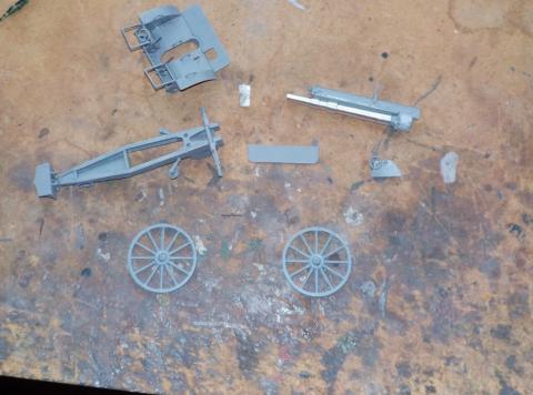 Stavbu zahájíme prozkoumáním návodu, začištěním dílů a přetmelením a vybroušením většiny nežádoucích propadlin a dutin. Zde doporučuji předbarvit díly, které se ocitnou po slepení uvnitř rámu lafety – je na ně po slepení vidět, ale štětcem jsou nedostupné. Vlastní lepení provedeme víceméně podle návodu, přičemž dáváme postupně dohromady několik podsestav. Začínáme rámem lafety – zde je velmi důležité uhlídat geometrii. Návod ani samotné díly neposkytují žádné prvky pro její úspěšné dodržení. Pokračujeme hezky provedeným rydlem. Jeho držáky jsou ale dosti tvarově komplikované drobné díly s několika velmi tenkými místy, takže se patrně zlomí už při oddělování od licího rámečku a budou mít tendenci zmizet beze stopy.