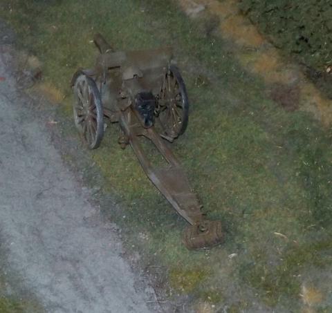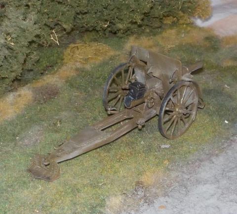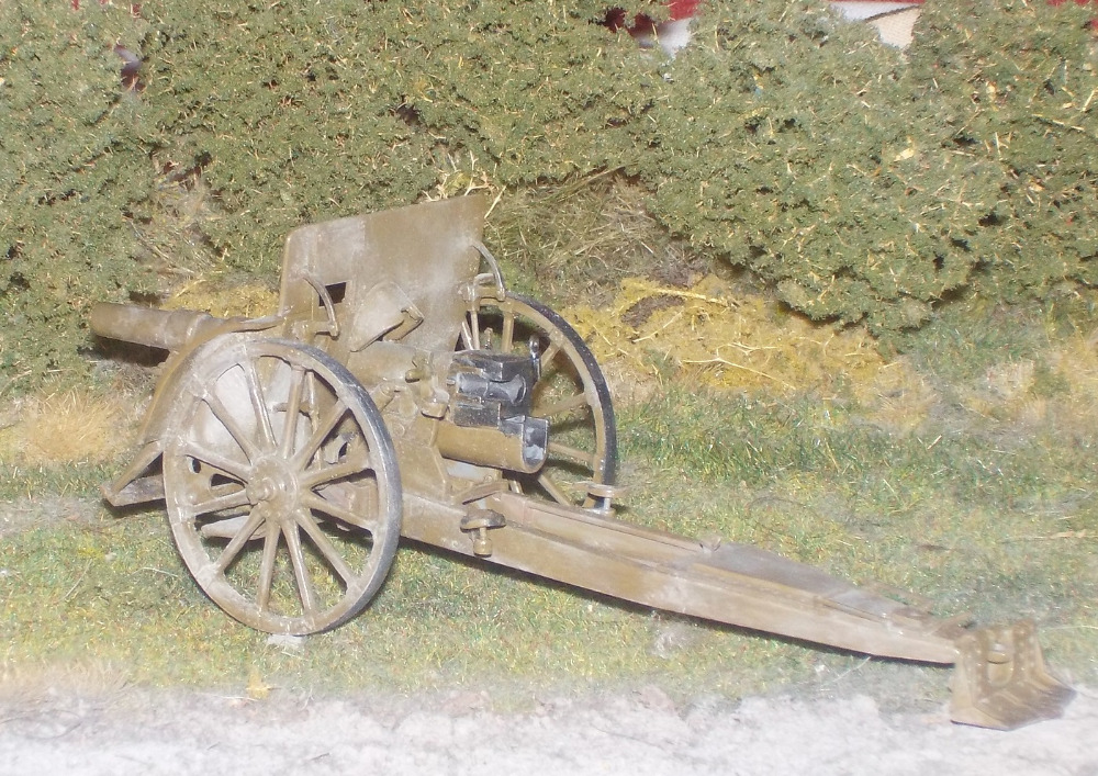 Poslední k opracování jsou kola – musíme je dopasovat na poloosy. Pak následuje sestavení na sucho – podsestava hlavně prolézá štítem stylem „ježek v kleci“, protože šrouby přední krytky brzdovratného zařízení výrazně trčí do stran. Následuje barvení jednotlivých podsestav – osobně jsem použil českou khaki od Agamy, ale je akademickou otázkou, jaký odstín by byl správný. „Pohřební“ kus z VHÚ je tmavě zelený, fleky na rekonstruovaném Lt-35 tyrkysové… Po zaschnutí nátěru jsem houfnici sestavil definitivně – vložil hlaveň do lafety, nalepil kola, zákolníky a štít, opravil poškození nátěru a kus napatinoval – nejprve „špinavým lakem“, pak ještě zaprášil práškovým pigmentem „prach“ a spodek lehce doplnil o rezavou směs „drážní špína“, původně namíchanou pro patinování kolejí. Po konečném sestavení mě zaskočilo, že model má na houfnici relativně malý náměr (patrně jsem nějakou část rámu umístil ve shodě s návodem na špatné místo) a pak – že má tendenci v měkčím terénu „padat na čumák“, protože duralová hlaveň je proti plastové výrazně těžší.