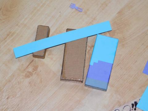 Zatím co budete lepit základní tvary z kartonu, mohou děti stříhat pruhy z barevných papírů na obalení - obarvení. Na tělo je to 6 cm široký fialový a tyrkysový .