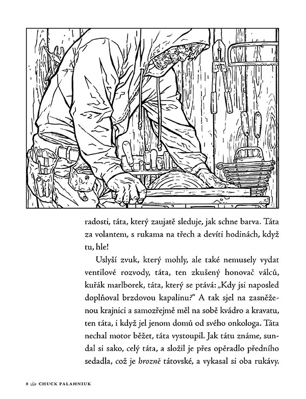 Relaxační omalovánky. To je současný hit. Lidé si vymalovávají superhrdiny, mystické obrázky, Harryho Pottera, mandaly, kytičky, krajinky… cokoliv. Omalovánky pro dospělé jsou něco, co lidi aspoň na chvíli odvádí od stresu současného světa. Ovšem když se do něčeho takového pustí tvůrce Klubu rváčů Chuck Palahniuk, tak si můžete být jistí, že to bude všechno jiné, jen ne relaxace.