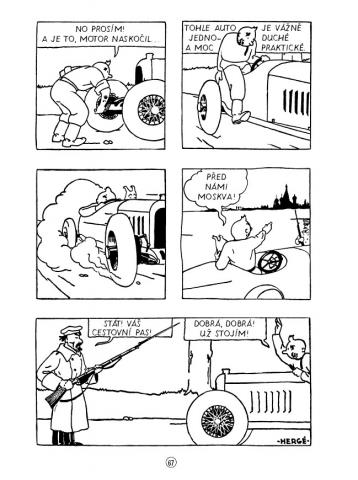 Nakladatelství Albatros se již podruhé odhodlalo v rámci vydání Tintina vystoupit z řady a obohatit ediční plán o jeho úplně první dobrodružství. Příběh Tintin v zemi Sovětů sepsaný Hergém (vlastním jménem Georges Prosper Remi) vybočuje hlavně grafickým zpracováním, kresby jsou neumělé, černobílé. Postavu Tintina sice čtenář poznává, ale po barevných verzích má problém se s takovýmto ztvárněním ztotožnit. V příběhu se reportér Tintin se svým psíkem Filutou vydává do revolučního Ruska, aby zjistil, jak je to doopravdy s komunistickým zázrakem na východě, aby tam zažil neuvěřitelná dobrodružství a se slávou se vrátil zpět. Zápletka je primitivní, tajní agenti GPU (předchůdkyně KGB) se snaží zlikvidovat Tintina, který všechny nástrahy zvládne překonat důvtipem i prostou silou. V době vzniku, tehdy se psal rok 1929, je až podivuhodné, jak některé podoby Sovětského svazu vystihl – např. přetvářky hospodářského úspěchu nebo konfiskace obilí kulakům. Takovýmto způsobem se v lednu 1929 v Belgii zrodila jedna z nejslavnějších komiksových postav – reportér Tintin. Jak už jsem zmínil, jeho úplně první příběh je celý černobílý a hlavní postava teprve získává své obrysy, které si pak udrží dalších 54 let.