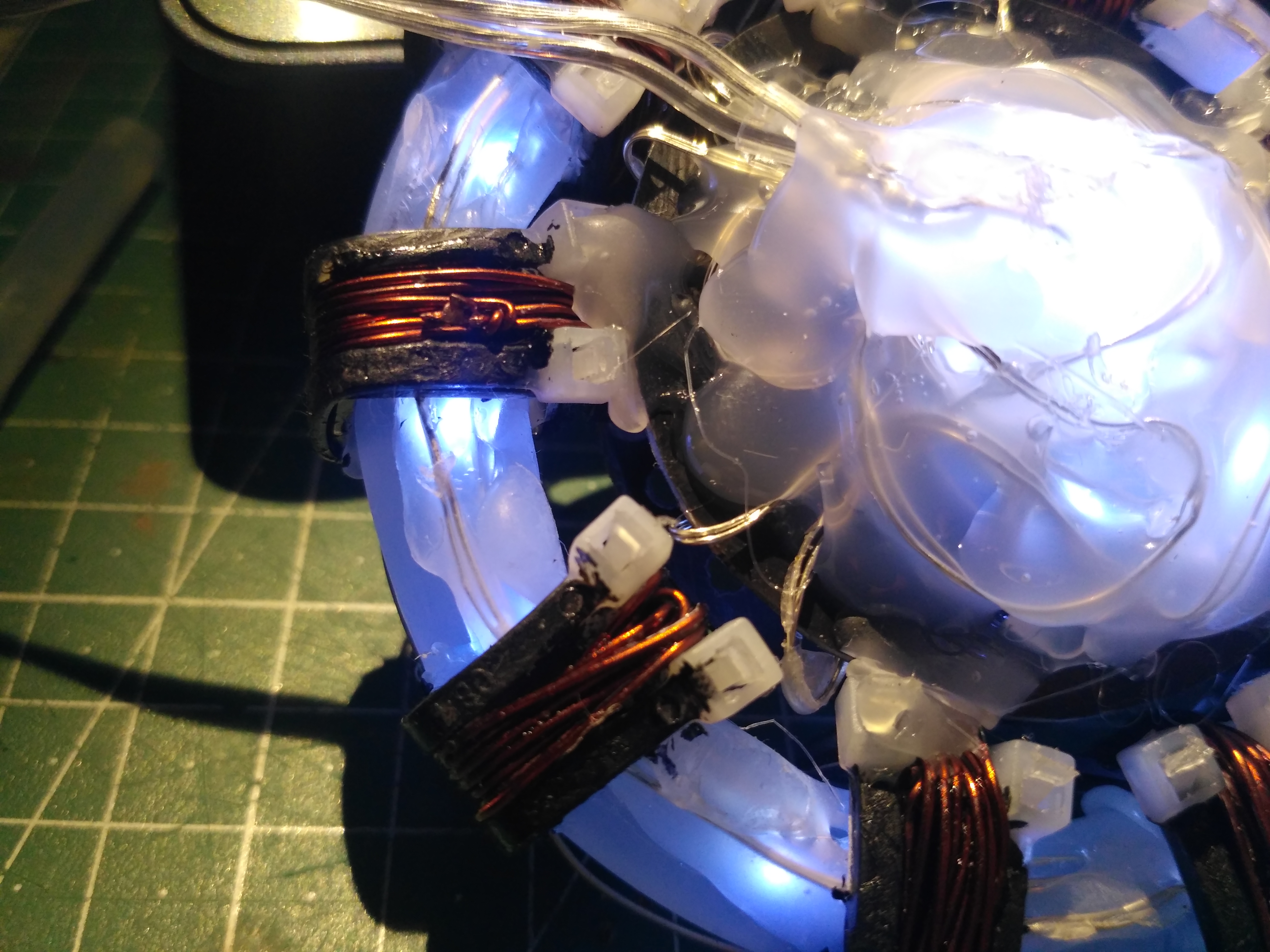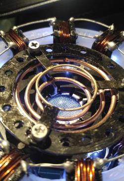Další, co uděláte, jsou okraje pro uchycení vinutí drátu. Já jsem použil pásky pro svazování kabelů, ale možností je spousta. Důležíté je, aby nám poté drát něco drželo a vinutí vypadalo přirozeně. Pořádně jsem pásky stáhnul tak, aby zámky byly uvnitř kruhu ze spodní strany a tím pádem nebyly vidět. Zapáskované okraje jsem natřel na černo, což vám při použití černých odpadne. Tyhle vodicí linky jsem zakápnul z více stran vteřiňákem. Jakmile bude zaschnuto, můžete se pustit do navíjení. Není to zas tak těžné, vyplatilo se mi si drát někde napevno zafixovat a po navinutí odštípnout oba konce a přlepit je zevnitř či zespodu nějak nenápadně vteřiňákem, aby se vinutí nerozvíjelo a vypadalo kompaktně a utaženě. Tím máme hotovou nejtěžší část a můžeme se pustit do vnitřku reaktoru.