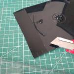 2) Dalším krokem je vinutí. Budete potřebovat nařezat část obalu DVD na plátky široké tak cm. Výšku a šířku určíte dle svého světelného kruhu. Tyhle destičky nařízněte a vytvarujte tak, aby obejmuly celý okraj jako na obrázku. Budete jich potřebovat 10. Začněte protilehlými a mezi ně pak umístěte ve stejných rozestupech vždy 4 další. Lepil jsem je opět tavnou pistolí. Některé návody používaly klasické dřevěné špachtle a po vykrojení přísušného tvaru a nabarvení – proč ne, stejně bude tahle věco pokrytá drátem.