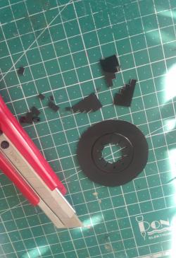 3) Vystřihneme kruh z vnitřku krabice na DVD a využijeme toho, že její střed držící CD je poněkud chatrný a vykrájíme tam kulatý otvor, aby do něj šlo vlepit těsnění se síťkou. Ideálně zespoda, protože nahoru vykrájíme schody – jako na obrázku, abychom do nich pak mohli zasadit ty kovové kroužky, o kterých netuším, na co tam mají být :). Než kruh zabudujeme, vystřihneme další a v něm otvor tak, aby nám zůstala cca 0.8 centimetru široká obruč. Do té se pak bude vrtat a lepit, takže by to měla vydžet.