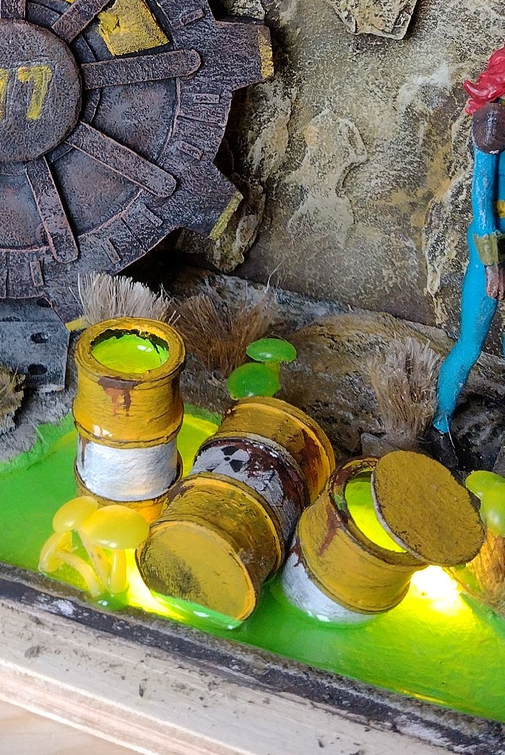 Prvně je potřeba opět plánovat, co a kam dáme. Já jsem chtěl, aby můj booknook ze světa Fallout stoprocentně obsahoval Vault/protiatomový kryt, a tak většinu zadní stěny zabírají dveře do něj. Protože se dveře otevírají jak ven, tak dovnitř, nemusím řešit nějaký prostor kolem a dejme tomu, že můj Vault 77 disponoval tou vnitřní variantou. Inspirací ke krajince kolem mi byl Vault 34 poblíž New Vegas, který se nachází v údolíčku a po jeho uzavření se před vrata ať už havárií, nebo schválně dostala hromada radioaktivních barelů. Se společností Vault-tec člověk nikdy neví. Nevěřil bych jim ani pozdrav. Tady ale spíše schválně, protože nad Vaultem se nachází bouda úložiště a další barel. Možná si je tam chtěli uskladnit jen na chvíli a pak dodpadly bomby... Každopádně můj Vault 77 je očividně násilně otevřený, a tak se dveře válí kus stranou a je vidět kousek vstupní haly s vnitřními dveřmi, zábradlím a tak. Světla kupodivu ještě fungují, i když podle stavu Vaultu je to s podivem. Stěny booknooku pak tvoří skály, na nichž občas roste nějaká ta houba, která v noci svítí a odráží se na nich radiační jezírko před branou. Tolik tedy k plánování, pusťme se do toho.