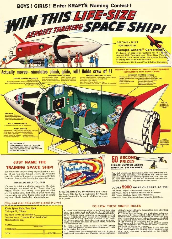 Takový byl například případ "Kraft Aerojet Training Space Ship". V roce 1959 společnost Kraft Food přišla s masivní soutěží pro děti. Inzeráty se objevovaly doslova všude. Vyhrajte kosmické ceny! Stačí poslat kopii inzerátu a obal od Kraft marshmallows na adresu sídla společnosti a vyhrajete spoustu skvělých věcí s kosmickou tématikou. Teleskopy, měsíční auta, vystřelovače raket, modely kosmických lodí nebo obrovskou Hammondovu vesmírnou mapu. Zní to lákavě, že, ale hlavní cena je jen jedna. Reálná tréninková raketa pro tebe a tři tvé kamarády!