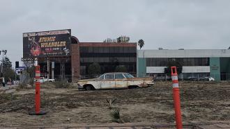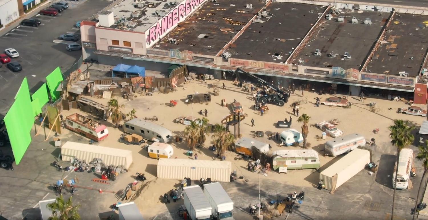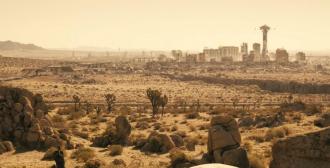 - Předválečné období: Vegas jako zářivé kasino město. Kulisy kasin byly nepoškozené, čisté, plné světel. Mírně matoucí je přítomnost cedule Vaultu 21 – ta je z reálných vaultových dveří, které by tam tehdy logicky být neměly. Alternativní realita? Marketingový artefakt? Spíše se na plátně neobjeví a překryje je zelené plátno.