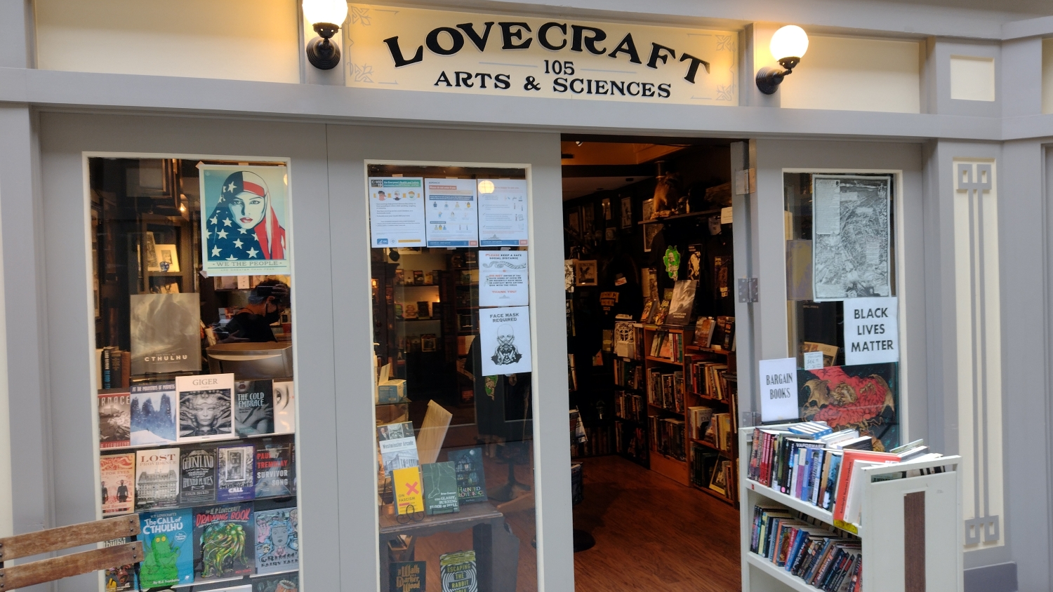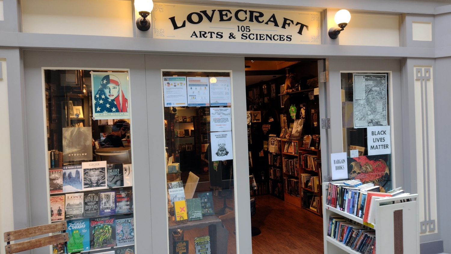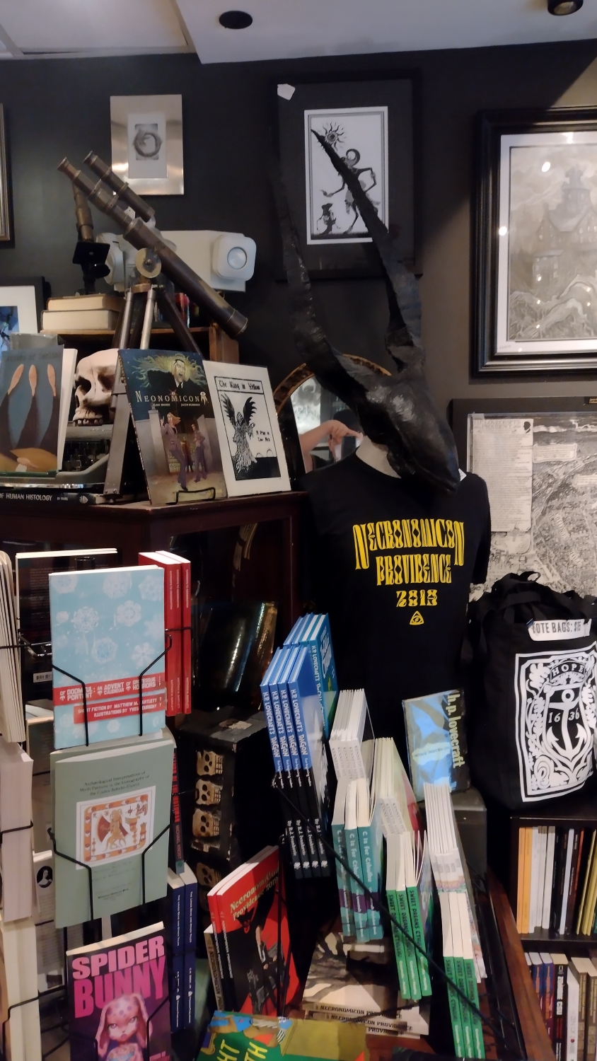První, na co jsme "náhodou" narazili, byl krámek Lovecraft Arts & Sciences, což je lovecraftovské centrum Providence a, jak jsem už vyjádřil v jiném článku, po hříchu skoro jediné místo, které se zde točí kolem slavného občana města. Skupina lidí kolem tohohle malého krámku má na svědomí vlastně vše, co je s Lovecraftem v Providence spojené. H. P. Lovecraft Film Festival a různé další akce jako NecronomiCon nebo Tour de Tentacle, setkání, výstavy, neoficiálně pojmenované náměstí, i sochu, která ovšem v době mého pobytu byla ukrytá v nějaké soukromé zahradě, a bustu, která byla v tu dobu taky bůhví kde. Opravdu pech, protože znovu sem rodinu fakt nedostanu.