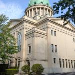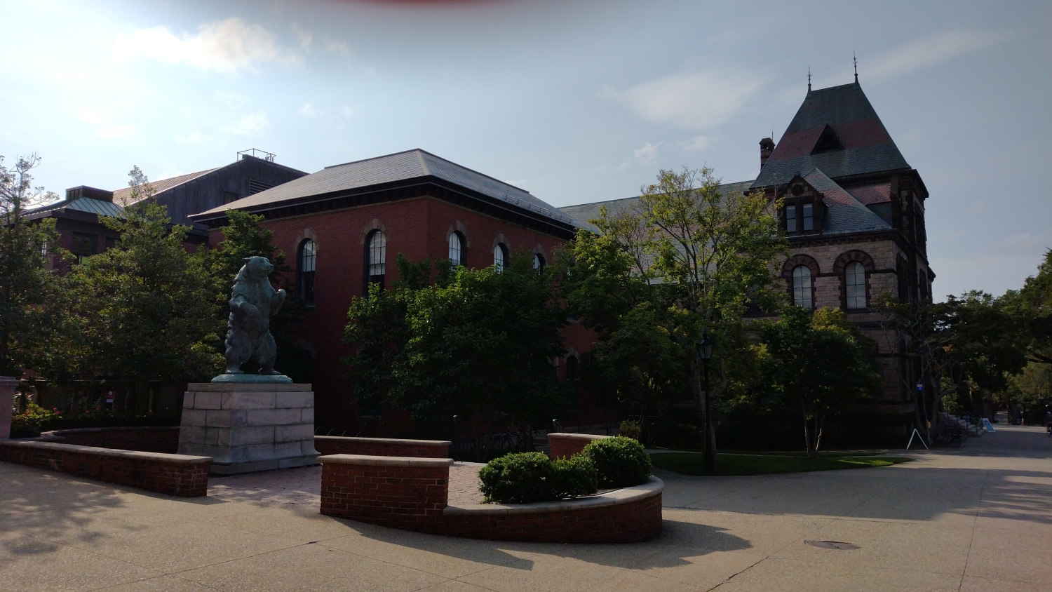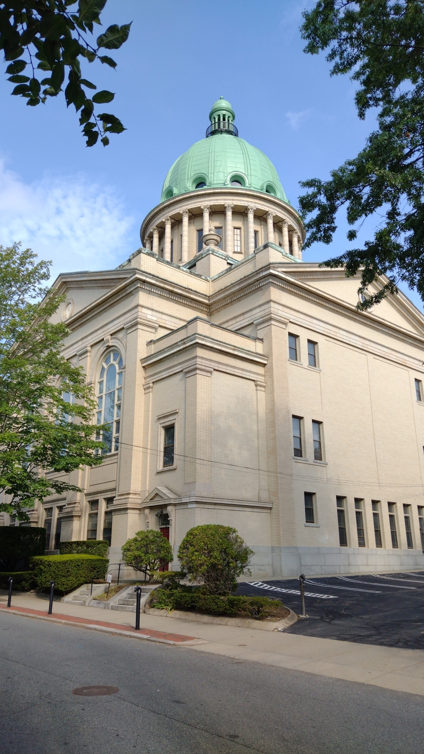Brownova universita je oproti Yale samozřejmě titěrná a procházet se vnitřkem vám nedovolí, ale posedět na prostranství před ní, nafotit sochu medvěda a budovy vám nikdo nezakáže. Tohle je Providence, ale je to taky trochu Arkham. A Brownova universita je taky trochu Miskatonická. Po nasátí atmosféry se vydáváme zpět kolem zmíněného ateliéru Fleur-de-Lys, což je fakt podivná stavba, která do Providence vůbec nezapadá. Na druhou stranu, když se podíváte dál na novější kýčovité kancelářské budovy, tak si myslím, že by Lovecraft přimhouřil oko. Hned naproti se nachází First Baptist Church in America, nenápadný bílý kostel, kam Lovecraft docházel.