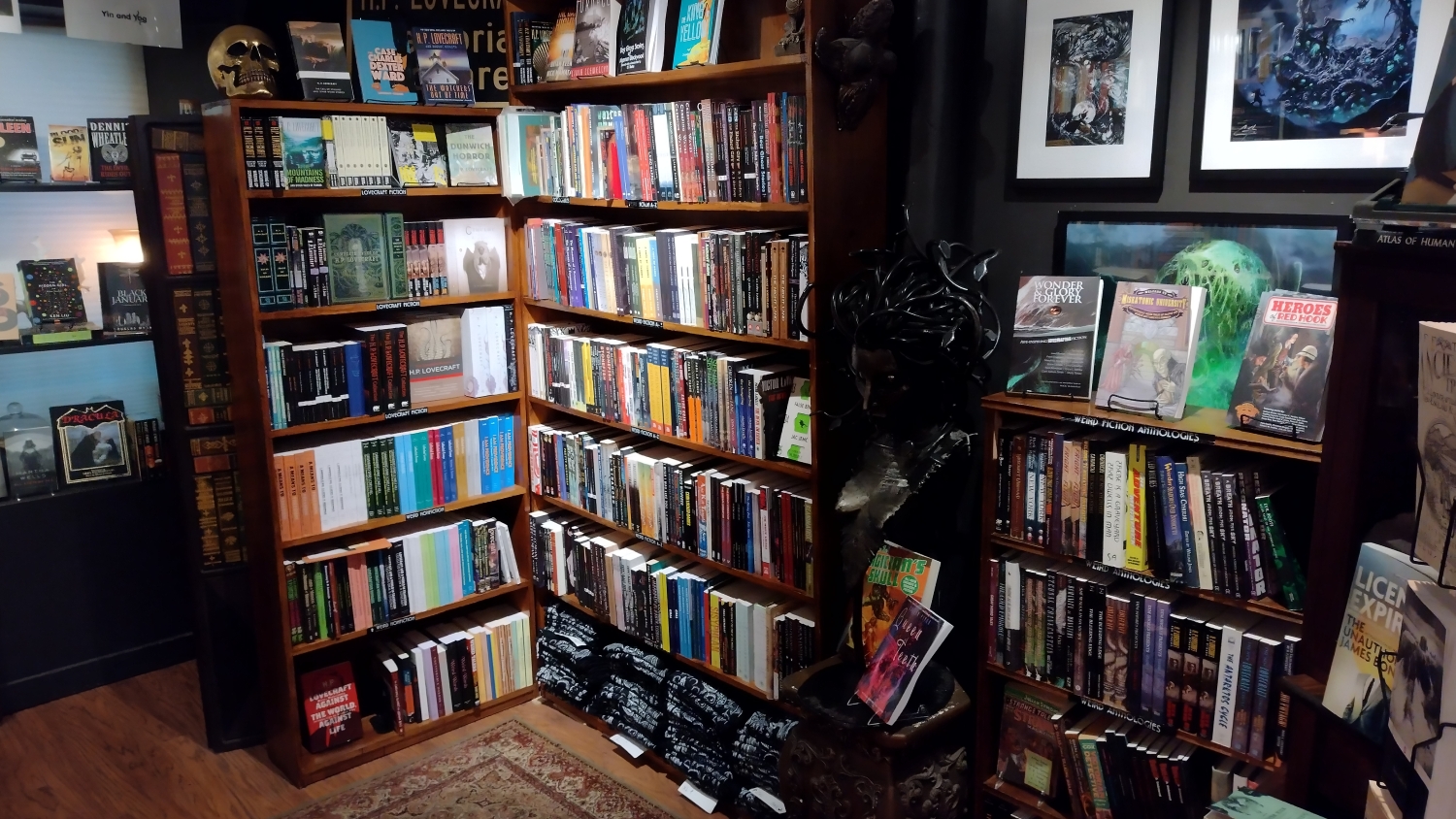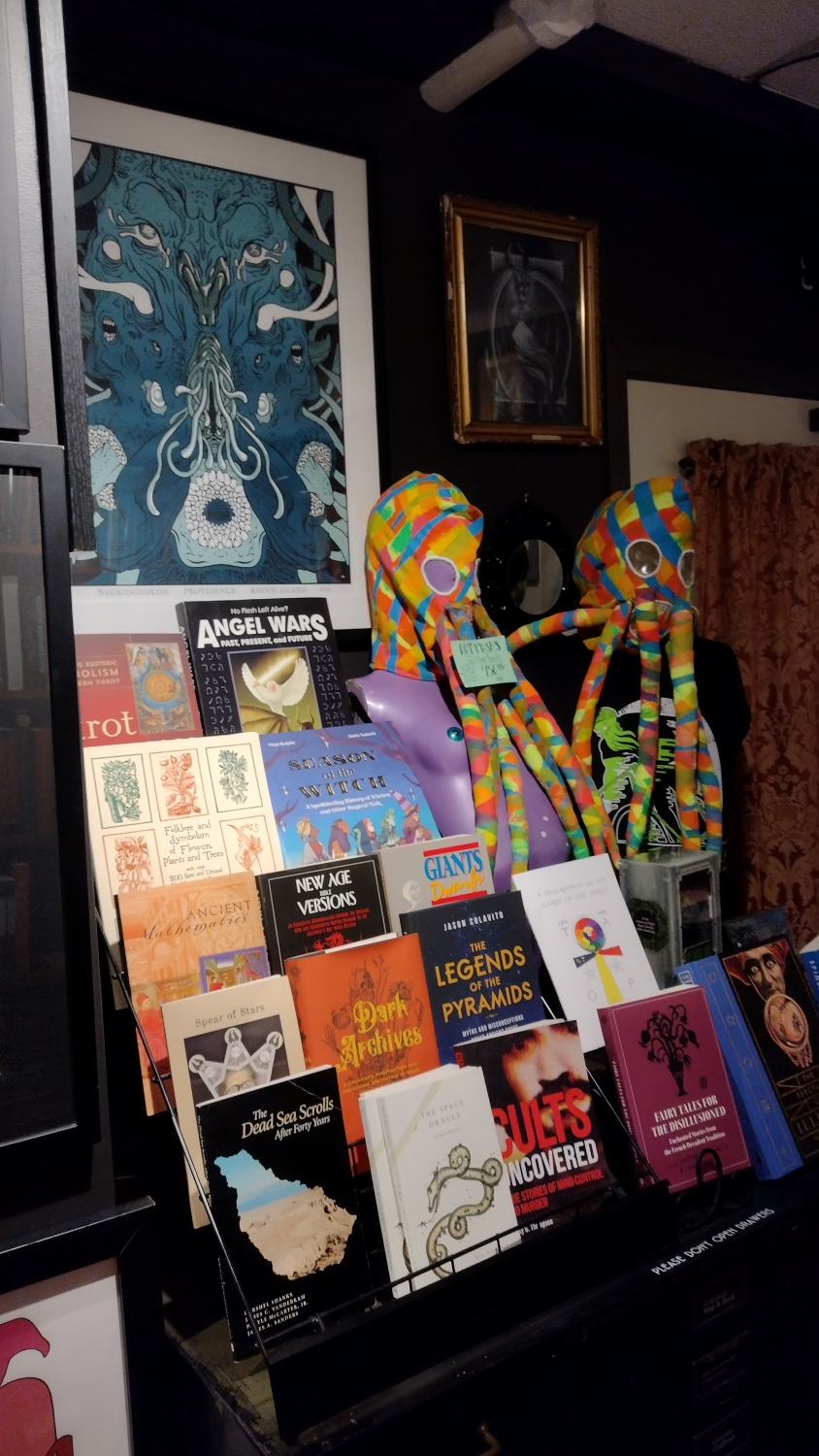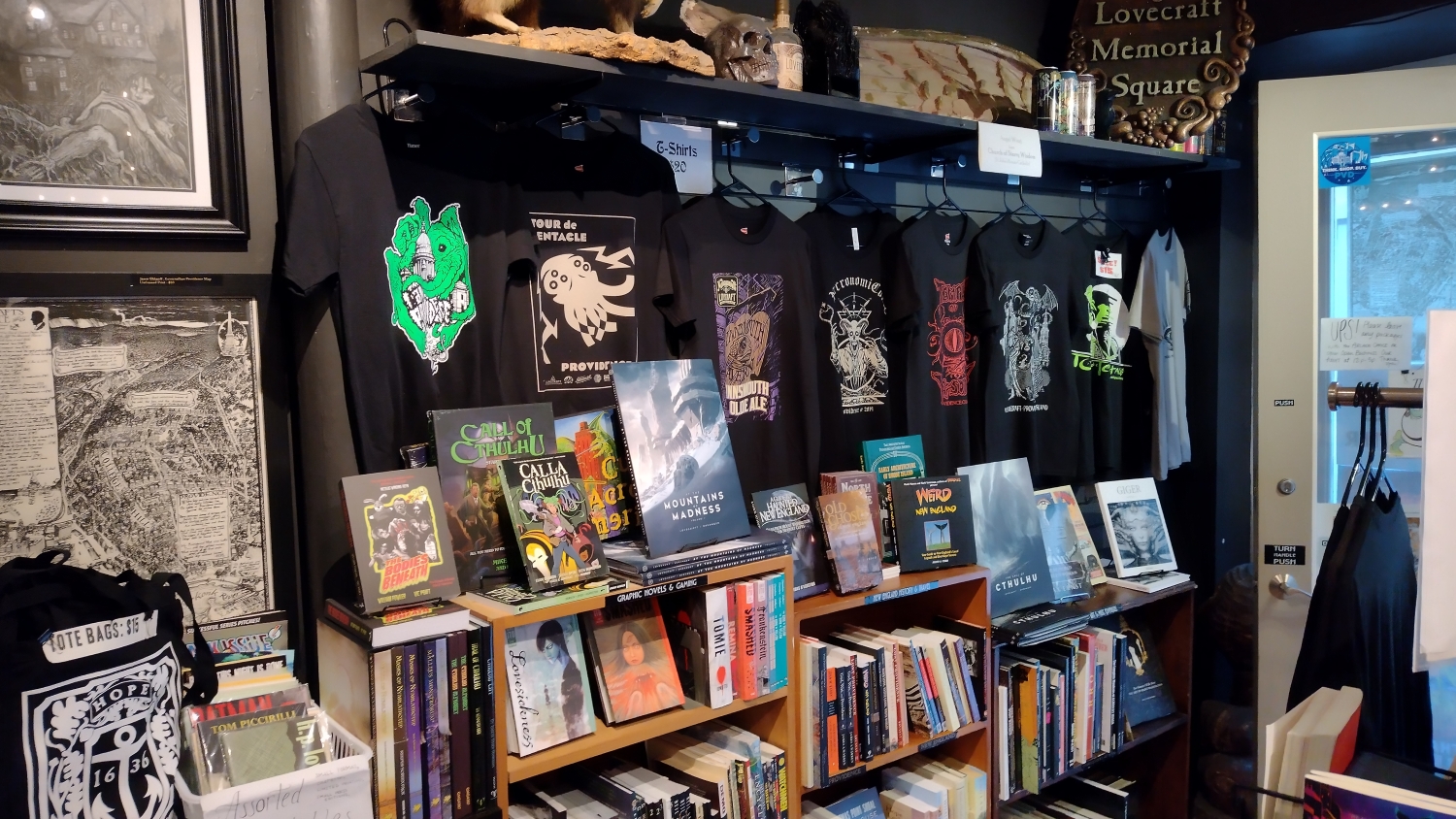 Na jednu stranu člověk musí ocenit to nadšení, ale na druhou, jakože cože? Čekal bych mnohem, mnohem víc. Lovecraft Arts & Sciences má rozlohu nějakých 25 metrů čtverečních, což opravdu není mnoho, ale na těch pár metrech je našlapáno úžasné množství lovecraftovských artefaktů. Primárně jsou to samozřejmě knížky, a to nejen od samotného mistra, ale vlastně cokoli, co se jen šustlo kolem kosmického hororu, Cthulhu, ale i čarodějnictví a okultních věd. Dětská leporela, komiksy, deskovky. Radost pohledět. Dále tu najdete vážný i nevážný merch. Různá trička k eventům, plakáty, sošky, obrazy innsmouthských obyvatel a podobně.