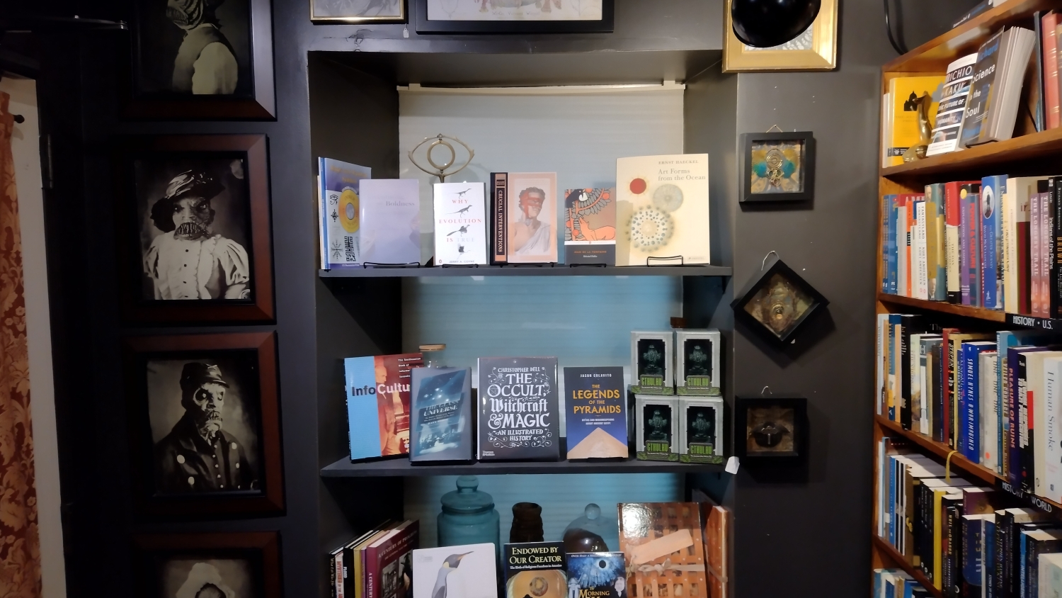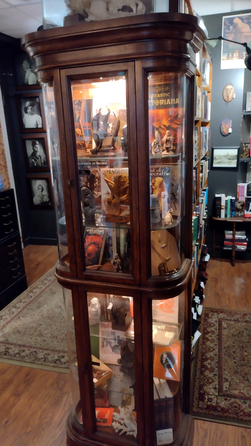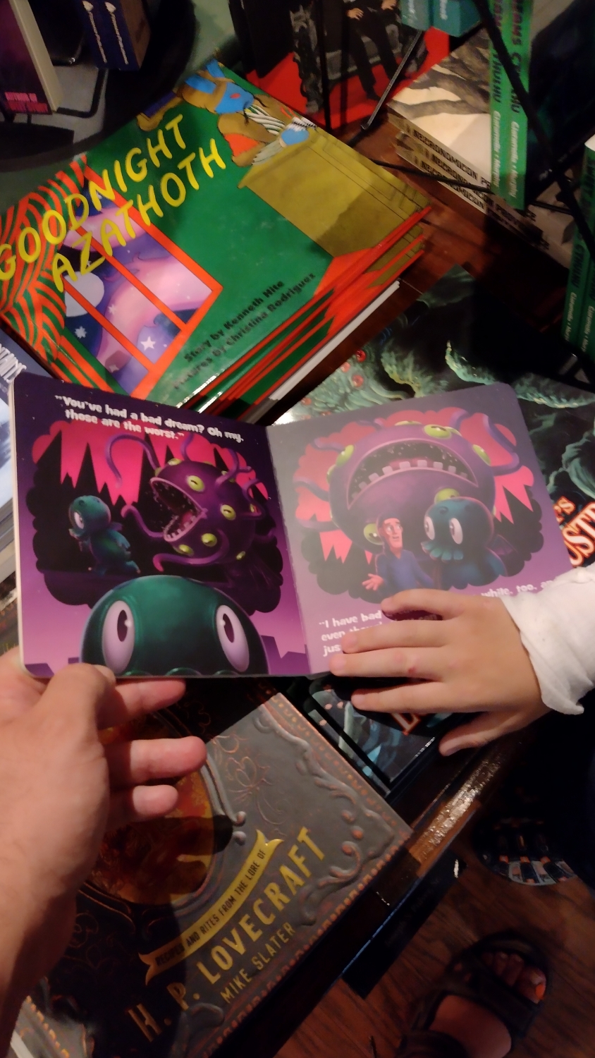 Na jednu stranu člověk musí ocenit to nadšení, ale na druhou, jakože cože? Čekal bych mnohem, mnohem víc. Lovecraft Arts & Sciences má rozlohu nějakých 25 metrů čtverečních, což opravdu není mnoho, ale na těch pár metrech je našlapáno úžasné množství lovecraftovských artefaktů. Primárně jsou to samozřejmě knížky, a to nejen od samotného mistra, ale vlastně cokoli, co se jen šustlo kolem kosmického hororu, Cthulhu, ale i čarodějnictví a okultních věd. Dětská leporela, komiksy, deskovky. Radost pohledět. Dále tu najdete vážný i nevážný merch. Různá trička k eventům, plakáty, sošky, obrazy innsmouthských obyvatel a podobně.