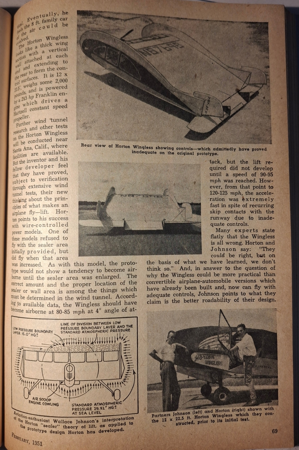 To „něco“ se jmenuje Horton Wingless Plane a posunuje už tak ztřeštěný nápad Horton Wingless V-16 do úplně jiné dimenze. Do jeho těla totiž zabuduje kabinu pro pasažéry a udělá z něj létající auto. Horton Wingless V-16 sám o sobě sice fungoval, ale měl dva motory a stabilizační křidélka. Jeho trup tvořil spíš talíř než kapku a boční plochy opět stabilizovaly let. Byla to prostě Multipla mezi letadly – hnusná, ale funkční.