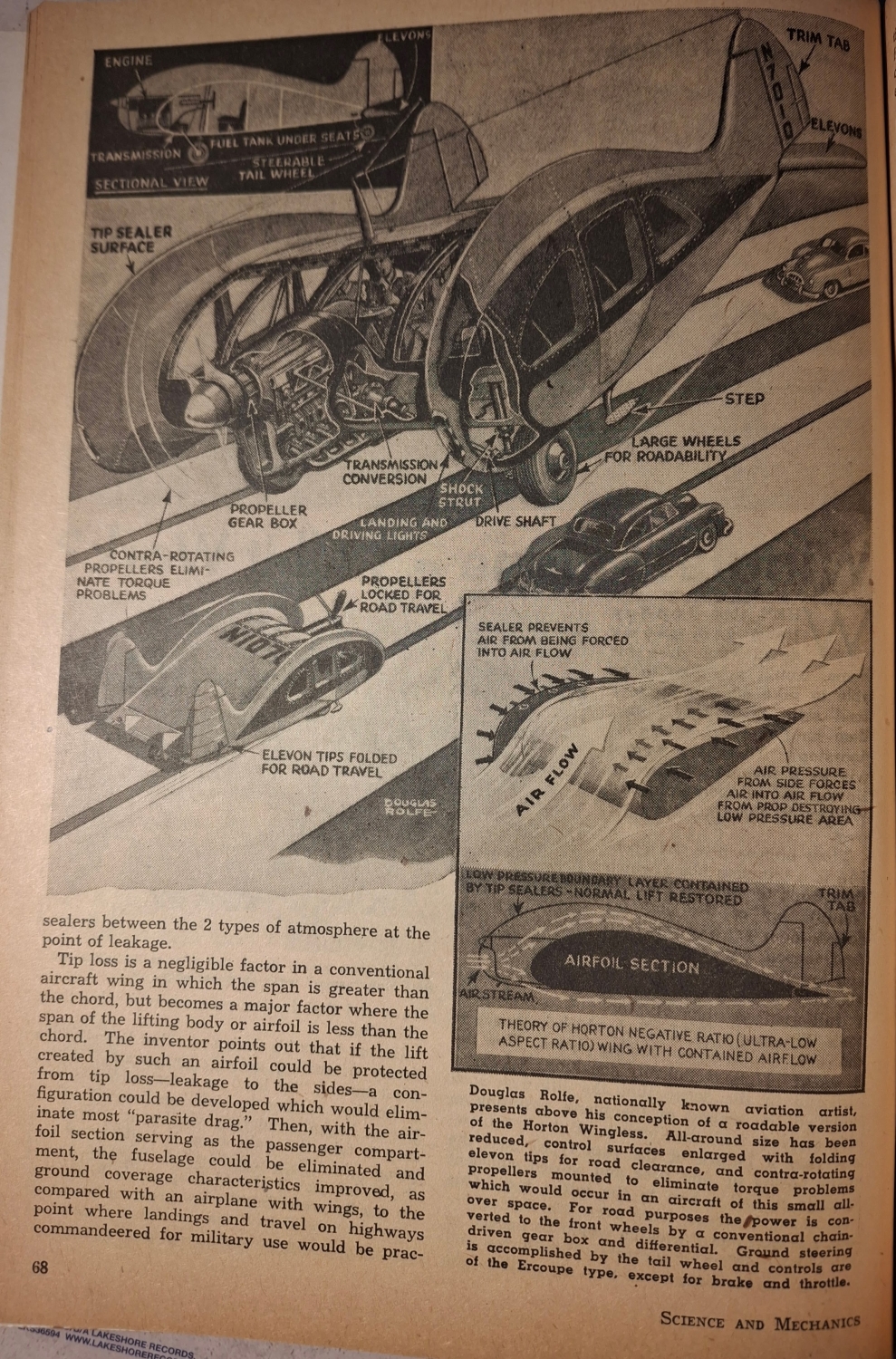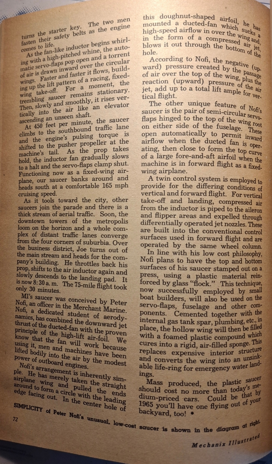 Nofi tvrdil, že dosáhne rychlosti až 165 mil za hodinu (265 km/h), vzlétne a přistane za vaším domem a bude stát „méně než automobil vyšší třídy“. Článek ho popisuje jako „ideální dopravní prostředek budoucnosti“, který „zruší potřebu letišť a otevře nebe každému občanovi“.