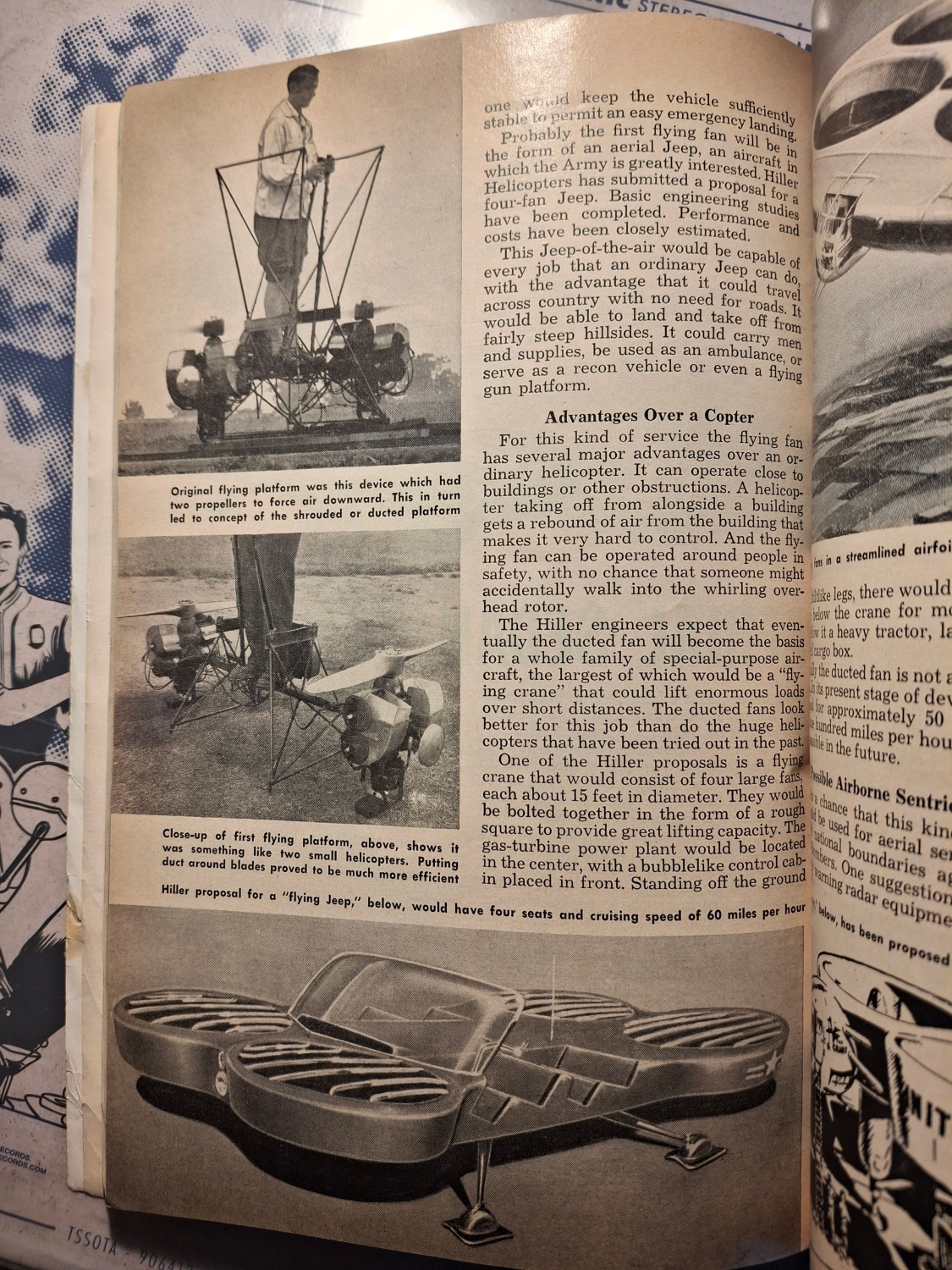 V roce 1957 popisoval Popular Mechanics Hillerův Aerial Sedan jako stroj, který „se vznesl přímo z vaší příjezdové cesty, vznášel se a letěl rychlostí až 160 kilometrů v hodině“. Měl být „novým druhem létajícího vozidla, které by jednoho dne mohlo nahradit rodinný automobil“. Pohon zajišťovaly čtyři velké dmychadlové ventilátory, „poháněné plynovými turbínami, které činí vertikální let jednoduchým a bezpečným“. Inženýři věřili, že „takový stroj může sloužit jak armádě, tak soukromým občanům“ a že „v budoucnosti možná vzniknou dálnice na obloze“.